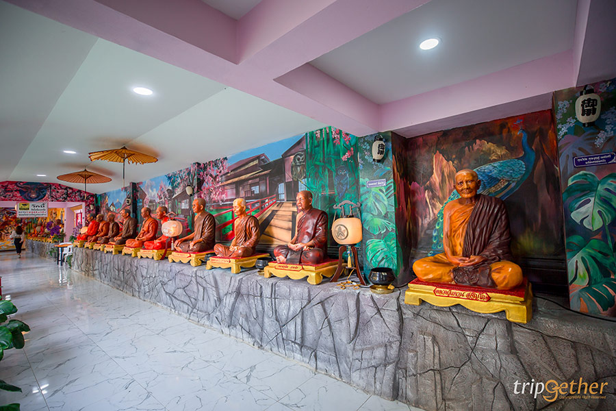 รอบวิหารมีรูปปั้นพระเกจิอาจารย์ชื่อดังจากหลายๆ วัดให้ได้กราบสักการะด้วย และใครที่เติมแต้มบุญเสร็จแล้วก็อย่าลืมเดินดูภาพวาดฝาผนัง ซึ่งภาพที่นี่ไม่ได้เป็นเรื่องราวพุทธประวัติเหมือนกับวัดอื่นๆ แต่เป็นรูปการ์ตูนญี่ปุ่น ภาพวาดทิวทัศน์ ภาพองค์เทพต่างๆ บอกเลยว่าสวยงาม สามารถเดินดูได้เพลินๆ เลย