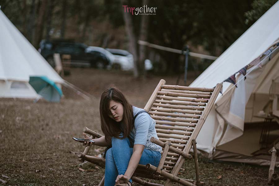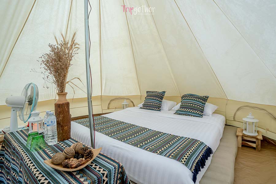 เข้ามาชมบรรยากาศภายในแค้มป์กันบ้าง ด้านในจะตกแต่งในสไตล์โบฮีเมียน มีสิ่งอำนวยความสะดวกครบครันทีเดียว มีไฟฟ้าให้แสงสว่างตลอดคืน มีที่ชาร์ต USB มีพัดลม มีผ้าเช็ดตัว สบู่ ยาสระผม จัดเตรียมไว้ให้เป็นอย่างดี และที่สำคัญเตียงที่นี่นุ่มมากระดับ 5 ดาวเลยเธอ!