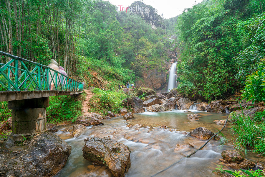 จากหมู่บ้านอีต่อง เราเดินทางกันต่อเนื่องจากฝนเริ่มตกลงมาอีกครั้ง เลยพลาดไปชมวิวสวยๆ ที่เนินช้างศึก เลยเปลี่ยนมาชมน้ำตกจ๊อกกระดิ่น แทน สำหรับค่าเข้าจะอยู่ที่คนละ 40 บาท/ผู้ใหญ่, 20 บาท/เด็ก และค่ารถคันละ 30 บาท จากจุดซื้อตั๋วเดินต่อไปอีกประมาณ 300 เมตร ก็ถึงน้ำตก ซึ่งทางเดินมายังน้ำตกเป็นทางไม้อย่างดี ที่เดินสะดวกสบาย ไม่ลำบากอย่างแน่นอน…