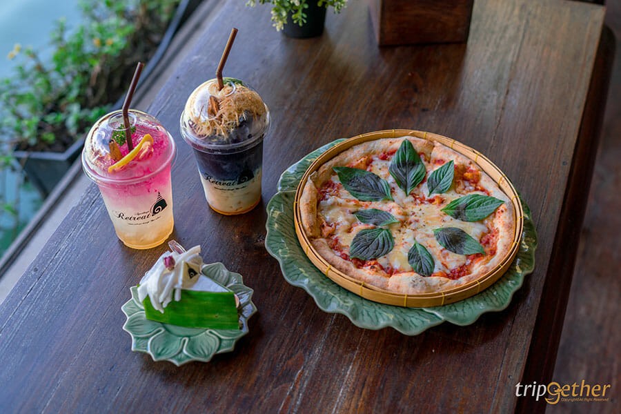 เผลอแป๊บเดียวก็ถึงช่วงกลางวันแล้ว วันนี้เราสองคนขอตัวไปฝากท้องฝากความหิวไว้ที่ คาเฟ่ รีทรีต อยุธยา ที่ตั้งอยู่ภายใน Ayutthaya Retreat คาเฟ่ ร้านอาหาร และที่พัก ที่รีโนเวทเรือนไทยโบราณอายุกว่า 70 ปี ให้กลายเป็นคาเฟ่และร้านอาหารน่านั่งริมสระบัว