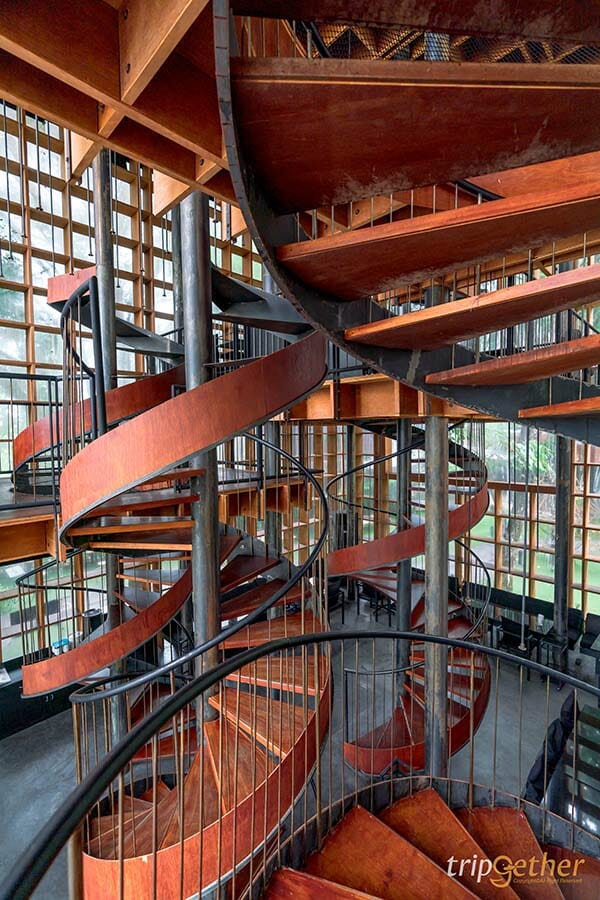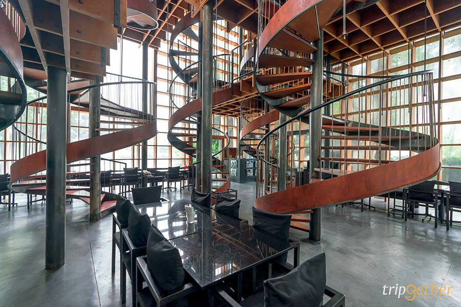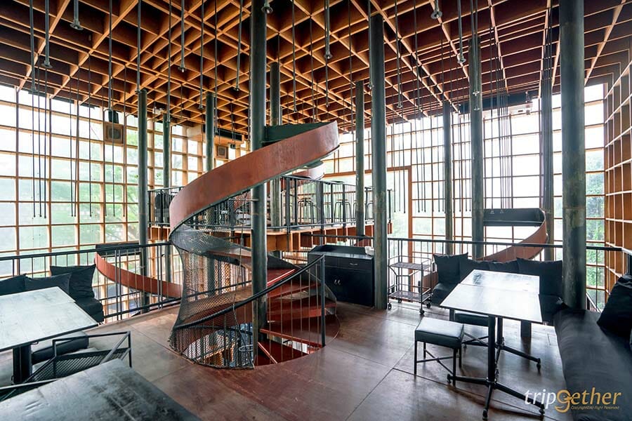 ภายในแบ่งโซนออกเป็นหลายโซน เพื่อเพิ่มมุมมองใหม่ๆ และลูกเล่นให้กับตัวร้านด้วยบันไดวนที่มีลักษณะคล้ายกับที่เปิดไวน์เป็นทางเดินขึ้นไปสู่มุมต่างๆ ของร้าน