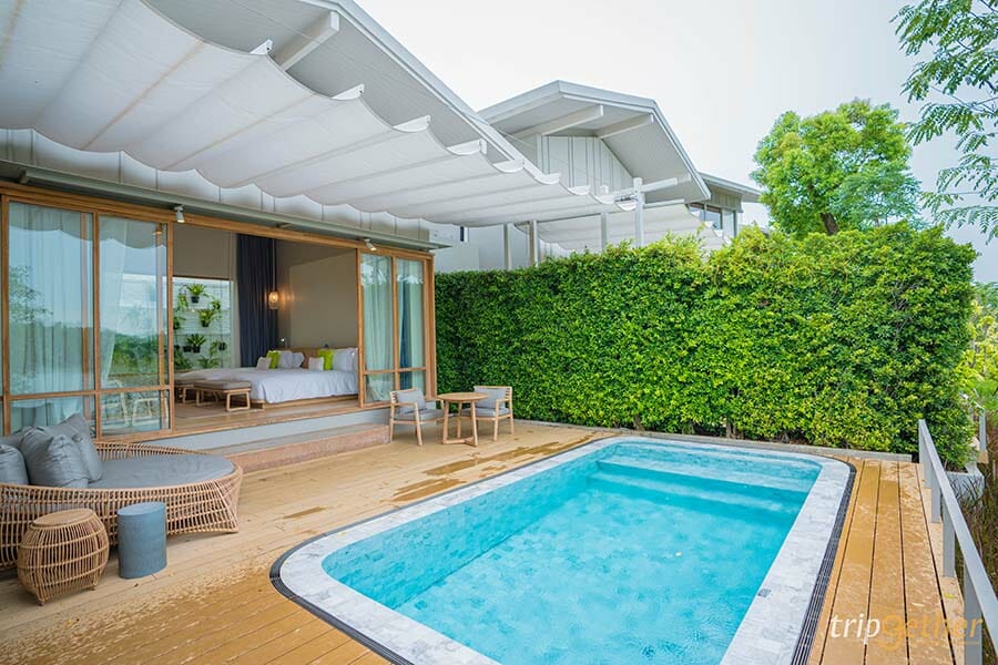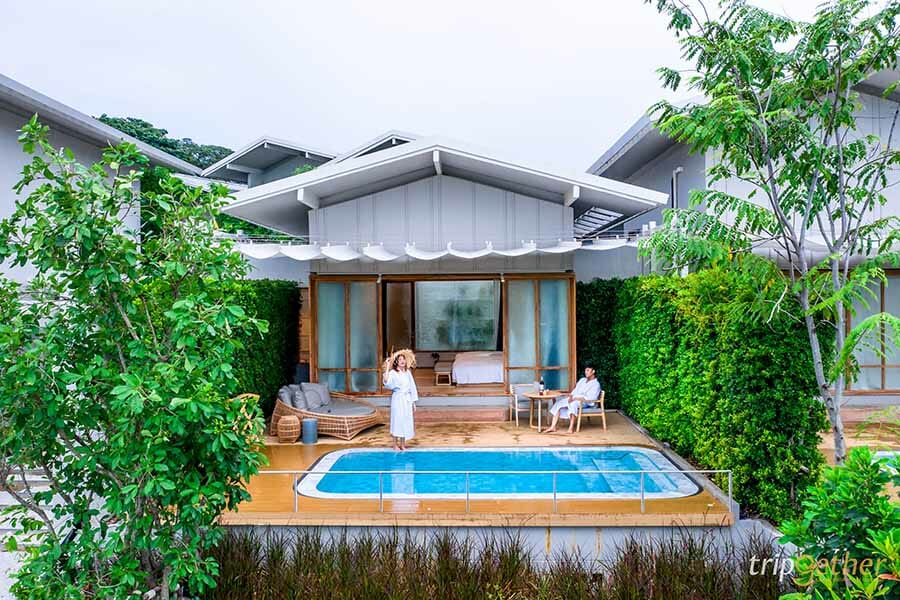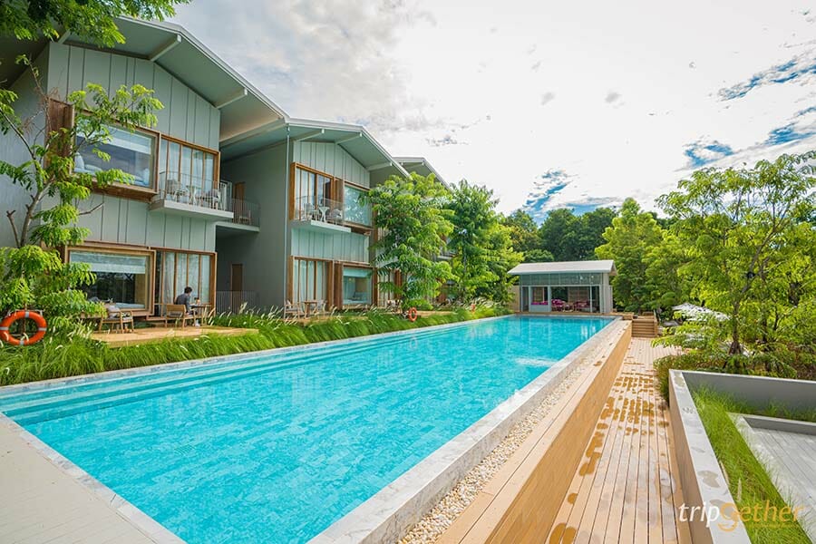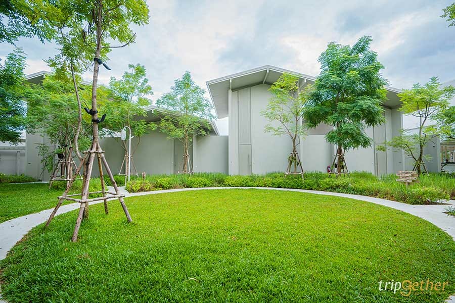 บรรยากาศบริเวณรอบๆ ที่พักยังร่มรื่นและเต็มไปด้วยต้นไม้น้อยใหญ่ ตอบโจทย์ทั้งความหรูหราและความสะดวกสบายสุดๆ
