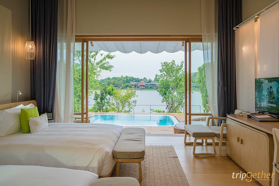เราเลือกพักที่ห้อง river view pool villa วิลล่าริมแม่น้ำเจ้าพระยาขนาดพอเหมาะ เน้นการใช้โทนสี ขาว เทา และน้ำตาล เป็นสีที่ดูสบายตาน่าพักผ่อน