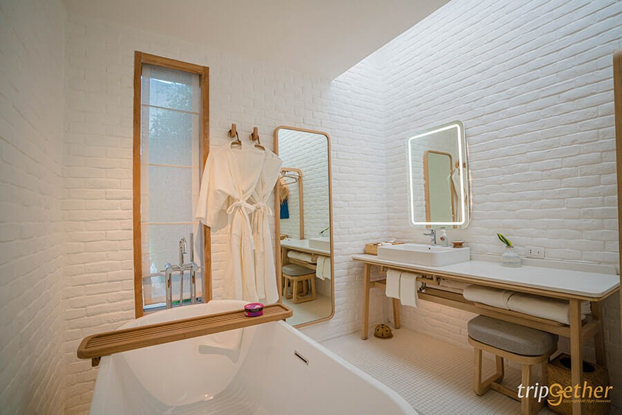 ห้องน้ำตกแต่งอย่างหรูหรา และได้รับแรงบันดาลใจจากสปา