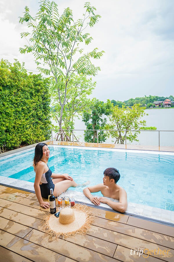 เดินทางเที่ยวตากแดดร้อนมาทั้งวัน เราสองคนไม่พลาดที่จะลงไปแช่น้ำที่สระว่ายน้ำส่วนตัวบริเวณระเบียงหน้าห้อง พร้อมจิบเครื่องดื่มชิลล์ๆ
