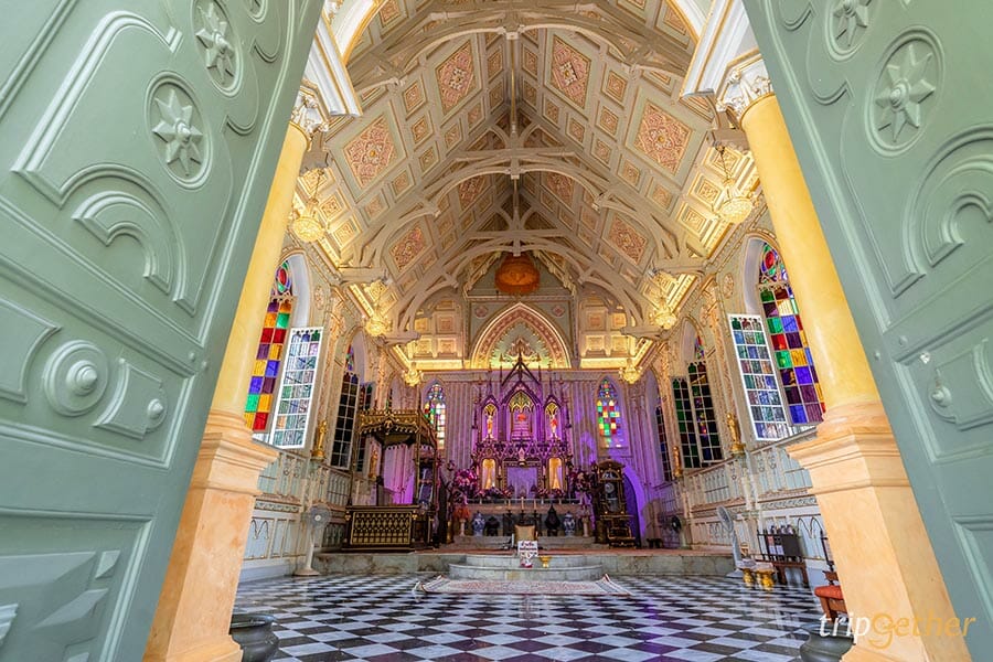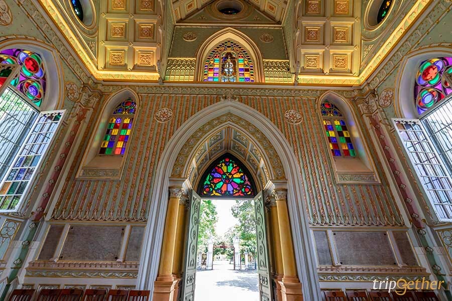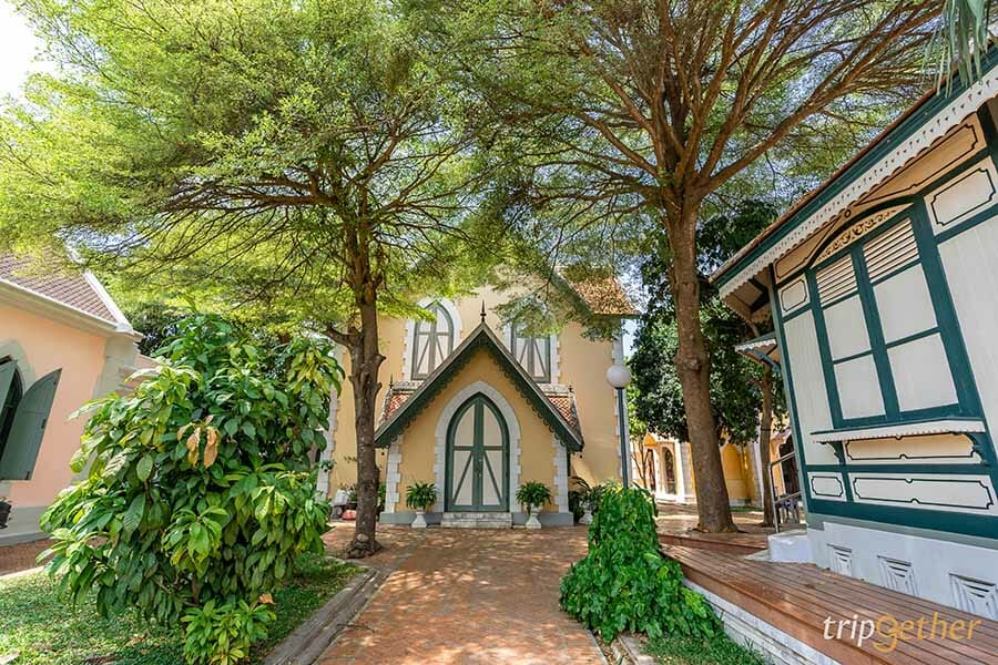 ภายในบรรยากาศร่มรื่น ถูกคลุมไปด้วยเงาของร่มไม้และสวนสวยเหมือนหลุดเข้ามาในต่างประเทศ เพราะรอบๆ เต็มไปด้วยตึกสวยสีสดใสสไตล์ยุโรป ส่วนมุมไฮไลท์ต้องยกให้กับความงามของอุโบสถ ที่ออกแบบโดยใช้ศิลปะแบบโกธิค