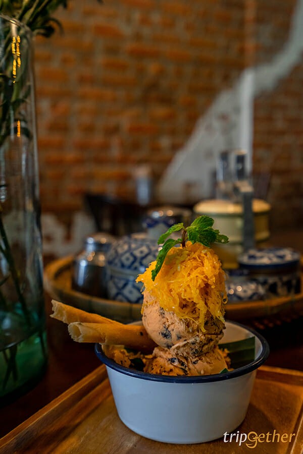 และเมนูแนะนำ ที่บอกเลยว่าห้ามพลาดคือ ไอติมหลงยุค ซึ่งเป็นเมนูชูโรงของร้าน ไอติมประยุกต์ชาไทย ชาเย็น ท็อปด้วยทองม้วน ฝอยทอง และถั่วบด ที่สายขนมหวานอย่างเราไม่ควรพลาด