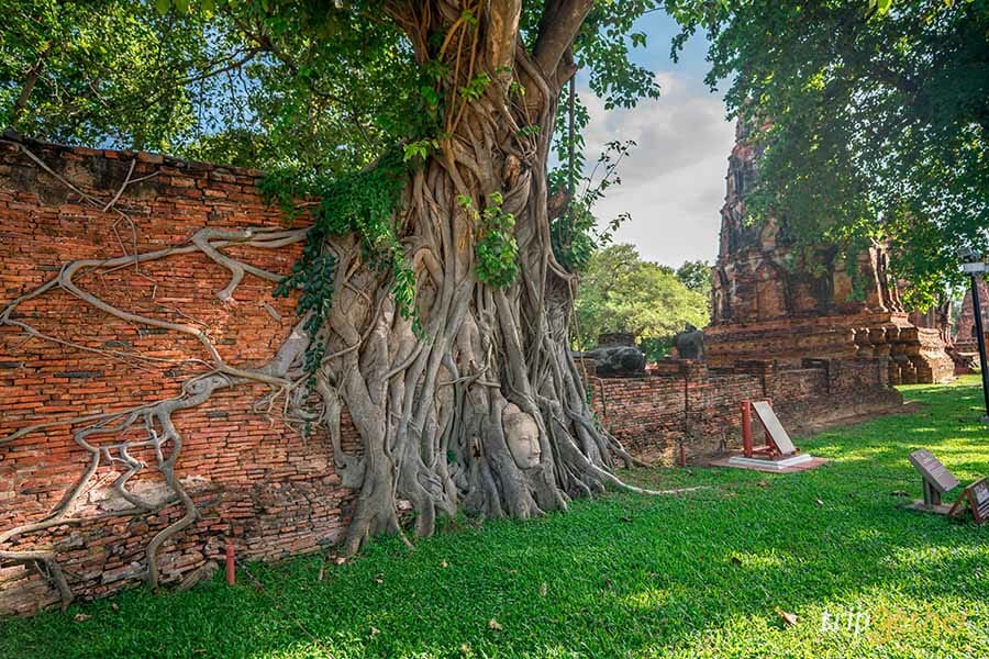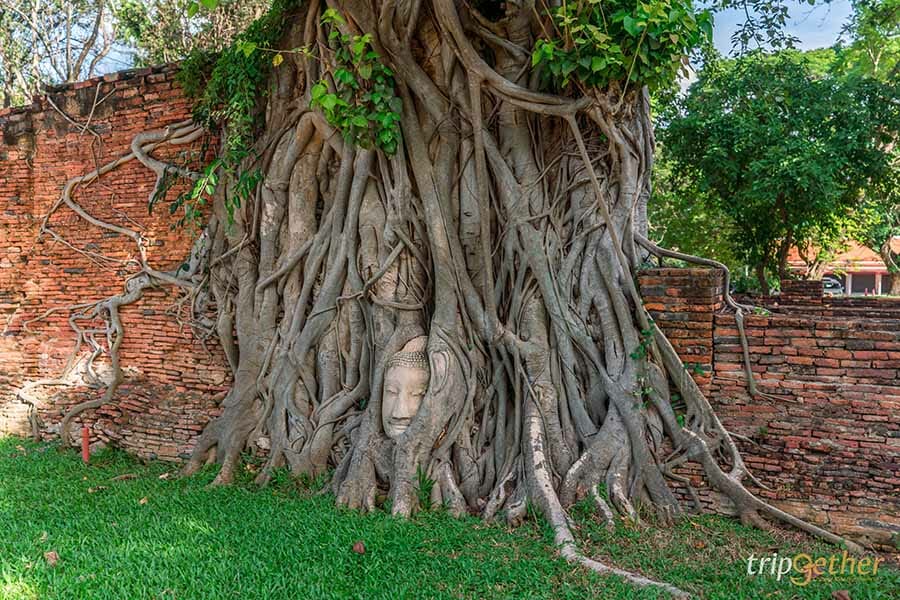 และไฮไลท์ของวัดมหาธาตุคือ เศียรพระพุทธรูปที่มีอายุมากกว่าร้อยปีที่อยู่ในรากโพธิ์ด้านข้างวิหาร ตามประวัติศาสตร์คาดว่าเศียรพระพุทธรูปน่าจะร่วงหล่นลงมาตั้งแต่สมัยเสียกรุงศรีอยุธยา เมื่อกาลเวลาผ่านไปรากของต้นโพธิ์จึงปกคลุมเศียรพระ ซึ่งเป็นความสวยงามระหว่างศิลปะที่มนุษย์สร้างขึ้นและความสวยงามทางธรรมชาติ