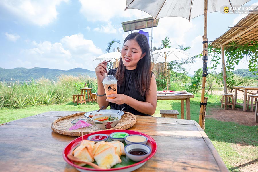 เมนูอาหารของทางร้านจะเสิร์ฟเป็นเมนูง่ายๆ ที่เป็นซิกเนเจอร์ของจังหวัดเพชรบุรี อย่างเมนู ขนมจีนทอดมันเสิร์ฟมาคู่กับแกงเขียวหวาน และชาไทยแฟ และขนมปังปิ้งเนย รวมๆ มื้อนี้อยู่ที่ 165 บาท