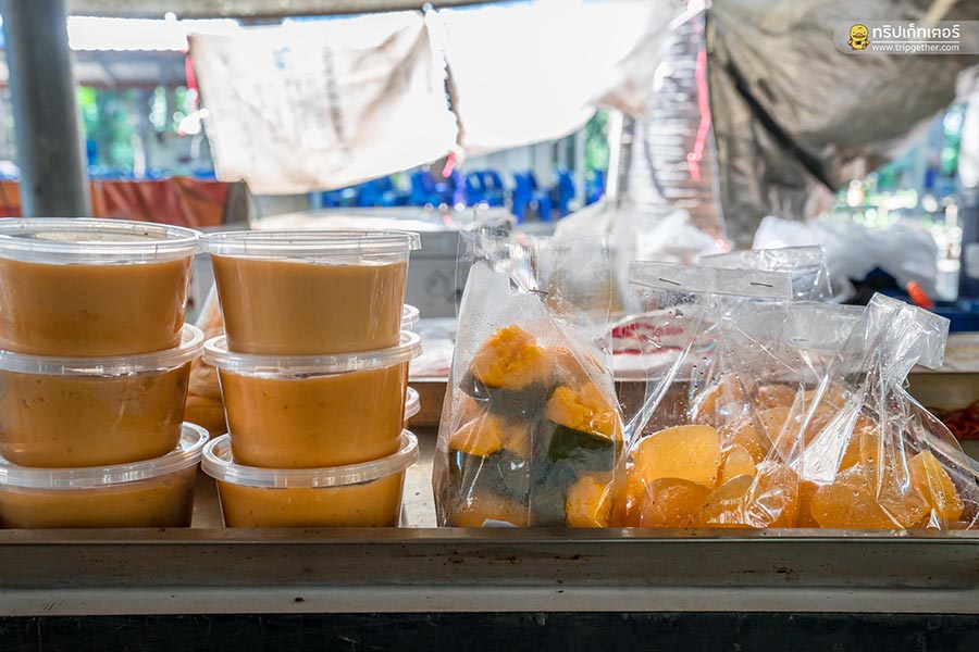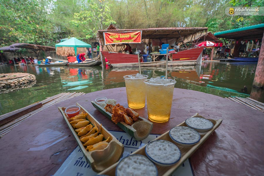 ส่วนอาหารของที่นี่ก็มีให้เลือกรับประทานหลายอย่างเลย แต่ต้องมาเร็วๆ หน่อย ถ้ามาบ่ายๆ เย็นๆ ตลาดอาจจะวายแล้ว ไฮไล์ของแต่ละร้านจะนำวัสดุจากธรรมชาติมาเป็นภาชนะแบบเก๋ๆ งบอาหารที่ตลาดก็จ่ายไปไม่เกิน 250 บาท ก็ได้ชิมของอร่อยๆ เพียบเลย ไม่ว่าจะเป็น ข้าวเหนียวไก่ทอด ส้มตำไทย หอยครก ขนมถ้วย และเครื่องดื่มสมุนไพร