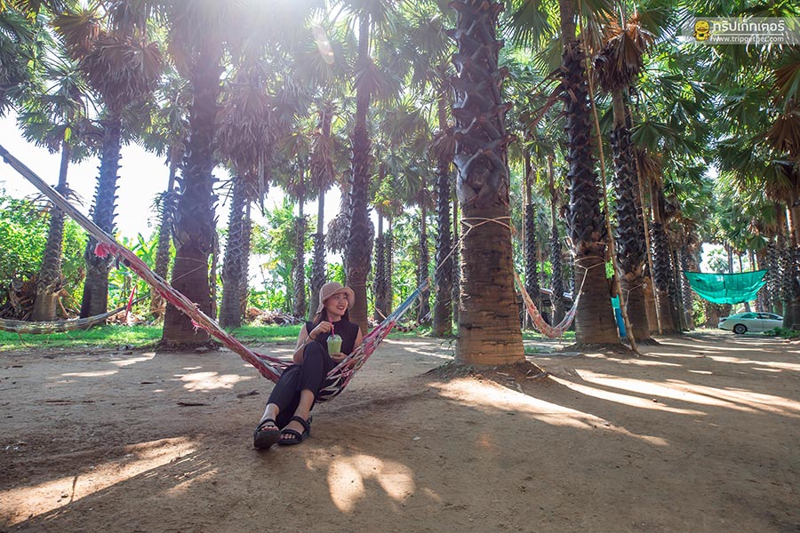มุมพักผ่อนในสวนตาล มีเปลผูกไว้ให้นอนพักผ่อนตามจุดต่างๆกันด้วย