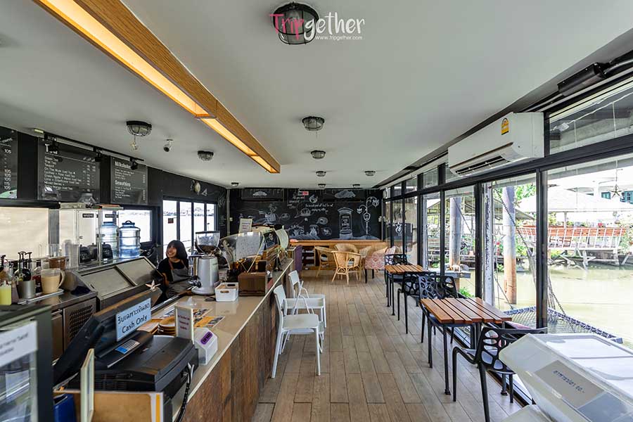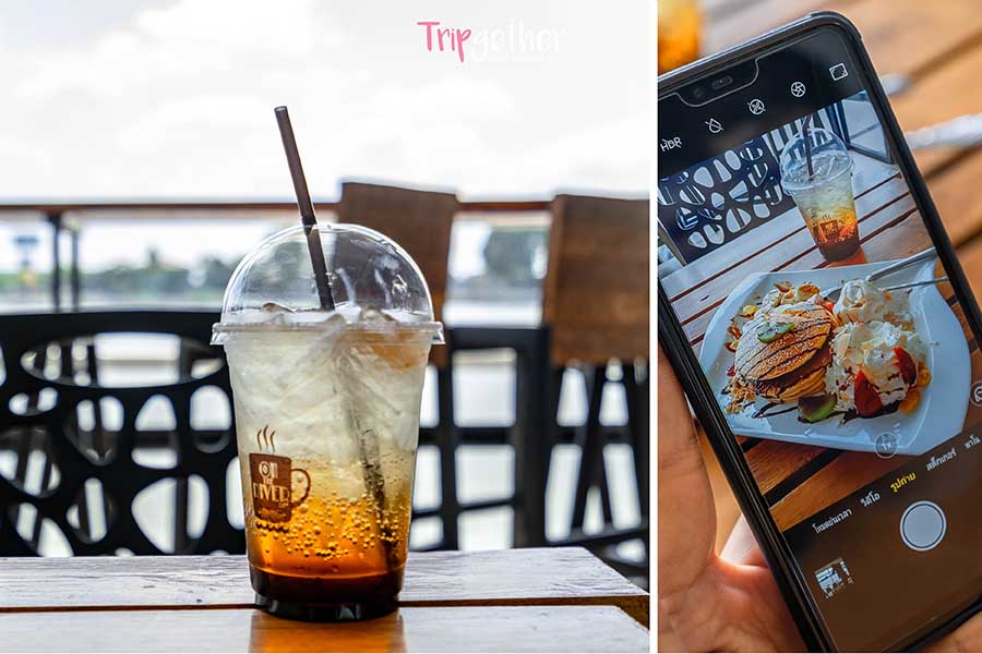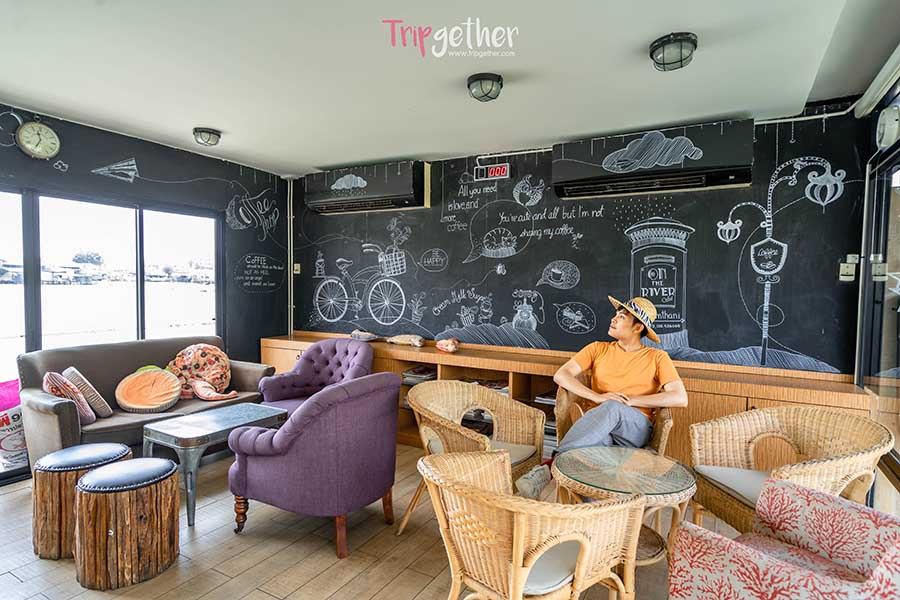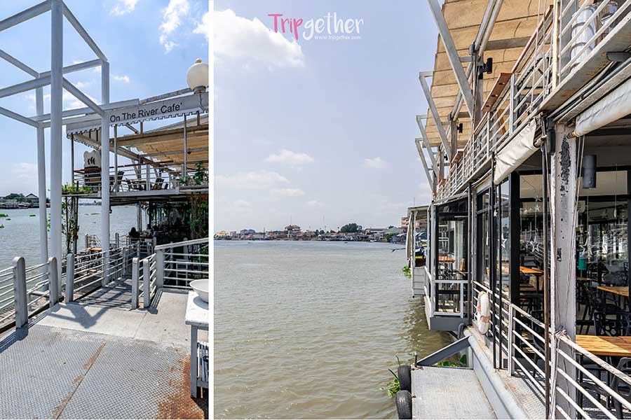 ยังไม่จุใจกับของอร่อย เราไปชิลล์กันต่อกับคาเฟ่สุดจี๊ดดีไซน์สุดแจ๋ว ที่ตั้งอยู่บนเรือสีขาวโดดเด่นไม่เหมือนใครที่ On the River Cafe ซึ่งใช้เวลาเดินทางจากวัด 20 นาที คาเฟ่นี้ตั้งอยู่ในซอยลึกติดริมแม่น้ำเจ้าพระยา ตัวร้านเป็นเรือแพ 2 ชั้น ภายในชั้นล่างเป็นมุมอินดอร์แอร์เย็นฉ่ำ มีบาร์ส่งกลิ่นหอมและมุมนั่งที่ค่อนข้างเยอะและหลากหลาย