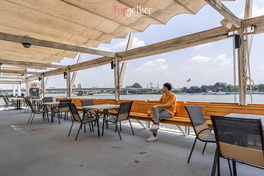 ชั้นสองเป็นดาดฟ้าเรือ มาพร้อมวิวสวยของแม่น้ำเจ้าพระยาแบบ 180 องศา เพลินแบบลืมเวลากันถึงช่วงเย็นกันเลย สำหรับร้านนี้เปิดให้บริการกันทุกวันตั้งแต่ 11.00-21.00 น. จะมานั่งชิลล์ถ่ายรูป หรือยกงานมาทำก็เป็นตัวเลือกที่ดีไม่น้อย