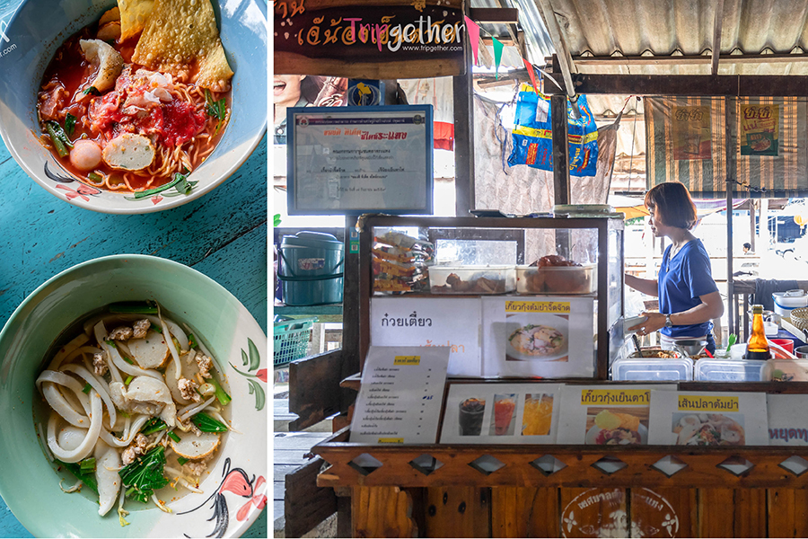 ส่วนมื้อเช้าเราเก็บท้องไว้ชิมเมนูอร่อยที่นี่ เราเลือกกินก๋วยเตี๋ยวกันที่ ร้านเจ๊น้อง ซึ่งอยู่บริเวณปากตลาด เป็นร้านก๋วยเตี๋ยวบรรยากาศบ้านๆ ติดริมคลอง