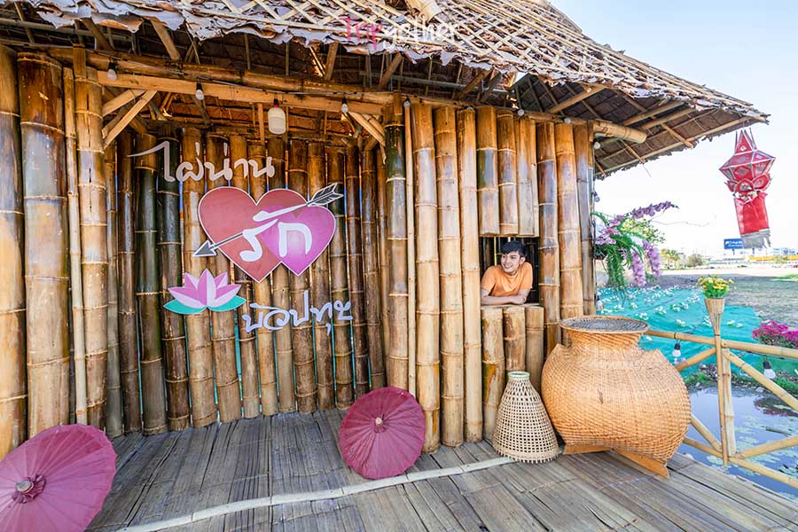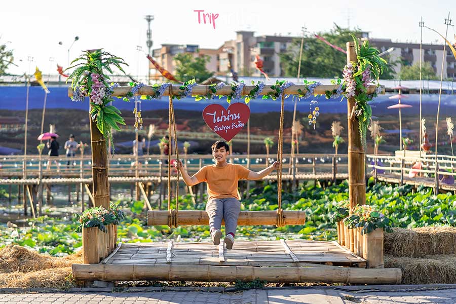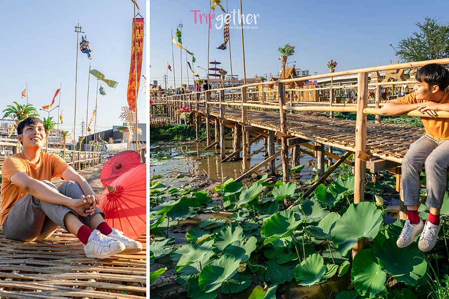 สะพานแห่งนี้ได้รับแรงบันดาลใจมาจากสะพานไม้ไผ่ของวัดศรีมงคล จังหวัดน่าน และใช้ไผ่ที่อิมพอร์ทจากน่านมาออกแบบ ด้านหน้ามีซุ้มประตุ้มสวยในสไตล์ล้านนา มากมายด้วยทางเดินที่ลอยตัวอยู่กับบึงบัวหลากหลายสีสัน ทั้งม่วง ชมพู ขาว