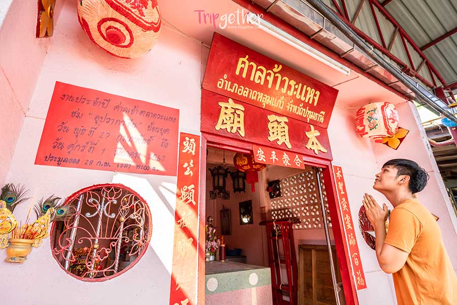 และเมื่อมาถึงตลาดแห่งนี้ก็ต้องไม่พลาดมาสักการะกับ ศาลจ้างระแหง ซึ่งเป็นเทพเจ้าของจีน ที่ชาวบ้านเชื่อกันว่าท่านจะให้พรเรื่องการค้าขาย โชคลาภ รวมถึงสุขภาพ เพื่อความเป็นสิริมงคลกันก่อนลุยกันต่อ