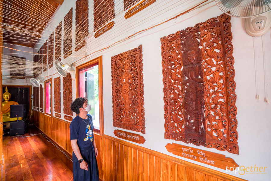 เมื่อเดินเข้ามาภายในโบสถ์ เราก็จะพบกับสุดยอดความอลังการของฝีมือช่างท้องถิ่น นั่นก็คืองานฉลุลายไทยไม้สักทองที่ติดเรียงกันอย่างสวยงาม เห็นแล้วรู้สึกภาคภูมิใจแทนคนในพื้นที่จริงๆ ที่มีหัตถศิลป์ดีๆ แบบนี้