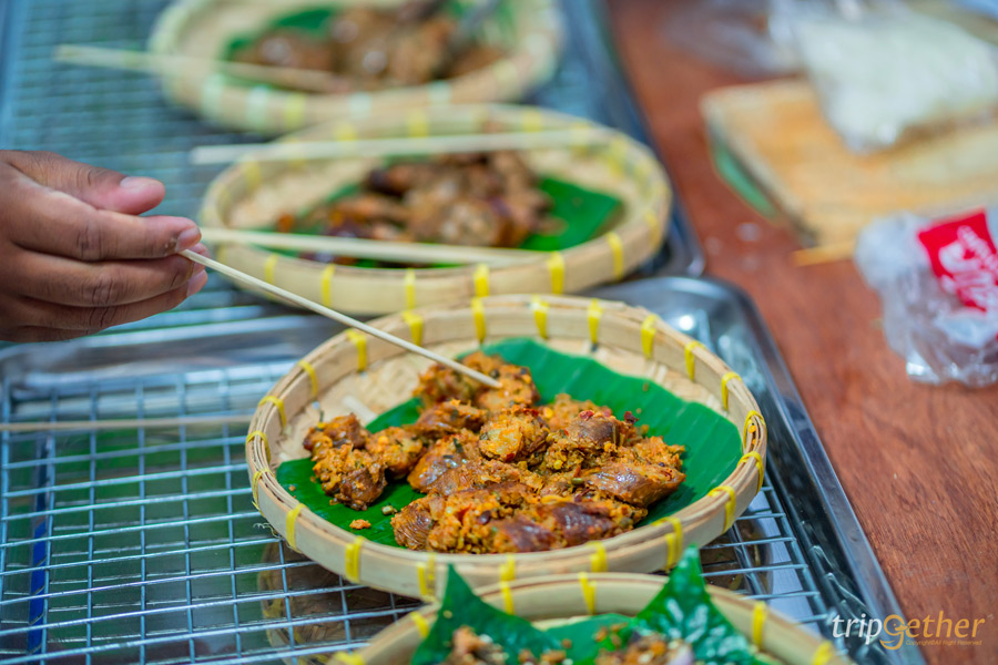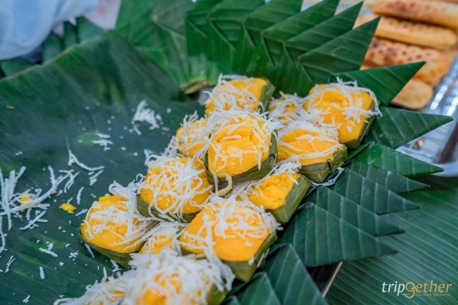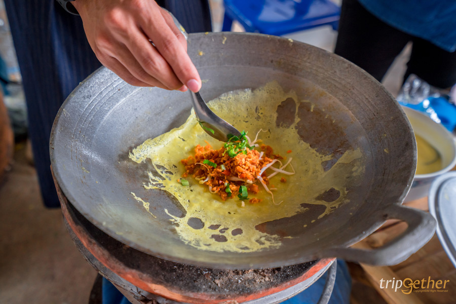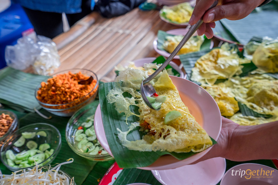 แป้งสีเหลืองนวลหอมๆ ที่ห่อหุ้มไส้ที่มีส่วนผสมทั้ง ผักกาดเค็มสับ กุ้งแห้ง มะพร้าวขูด ถั่วงอก ผักชี และถั่วเอาไว้ ราดด้วยน้ำอาจาดที่รสกำลังดี เมนูนี้อร่อยประทับใจสุดๆ