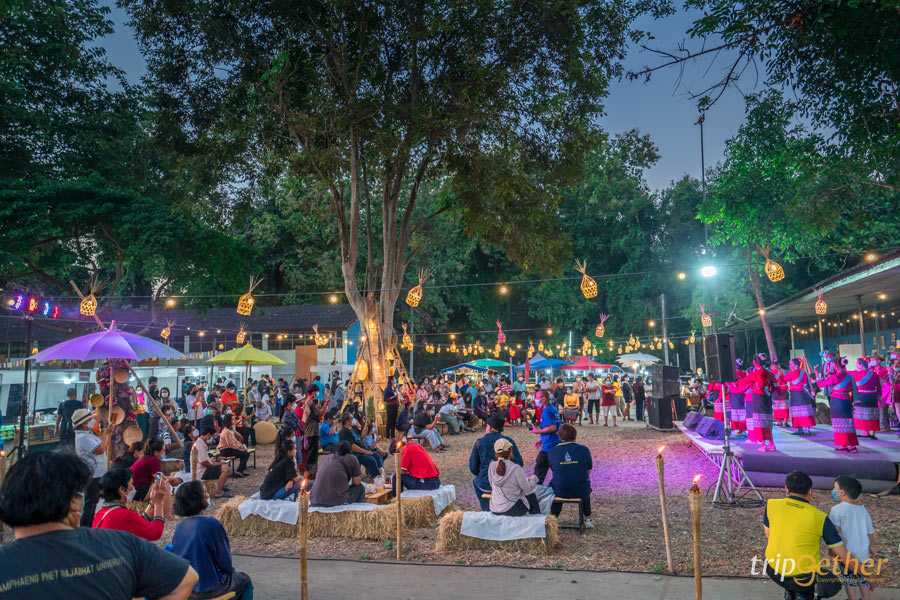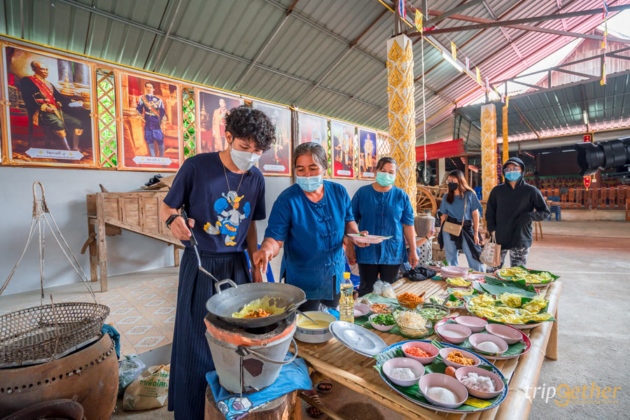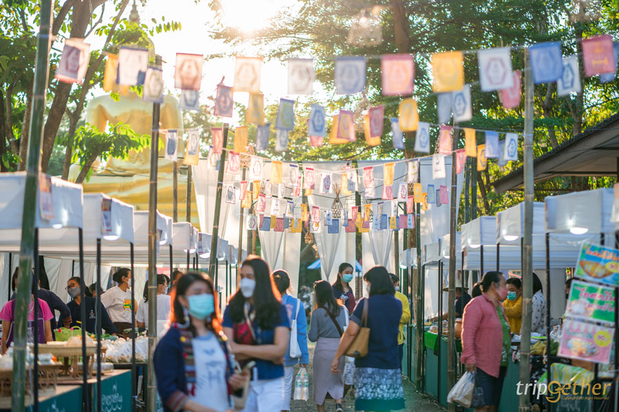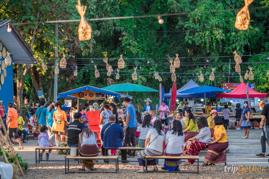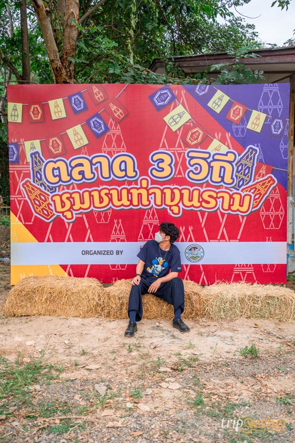 และแล้วช่วงเวลาเย็นก็มาถึง เรากลับมากันที่วัดอุทุมพรอีกครั้ง เพราะในวันที่เราไปตรงกับวันที่ชาวชุมชนในตำบลท่าขุนรามจัดกิจกรรมตลาด 3 วิถี บอกเลยว่าโชคดีมากๆ เพราะนอกจากจะมีตลาดถนนคนเดินเล็กๆ แล้ว ยังมีกิจกรรมที่ชาวชุมชนเปิดโอกาสให้นักท่องเที่ยวและผู้ที่สนใจอย่างเราๆ เข้าไปมีส่วนร่วมอย่างเป็นกันเองด้วย