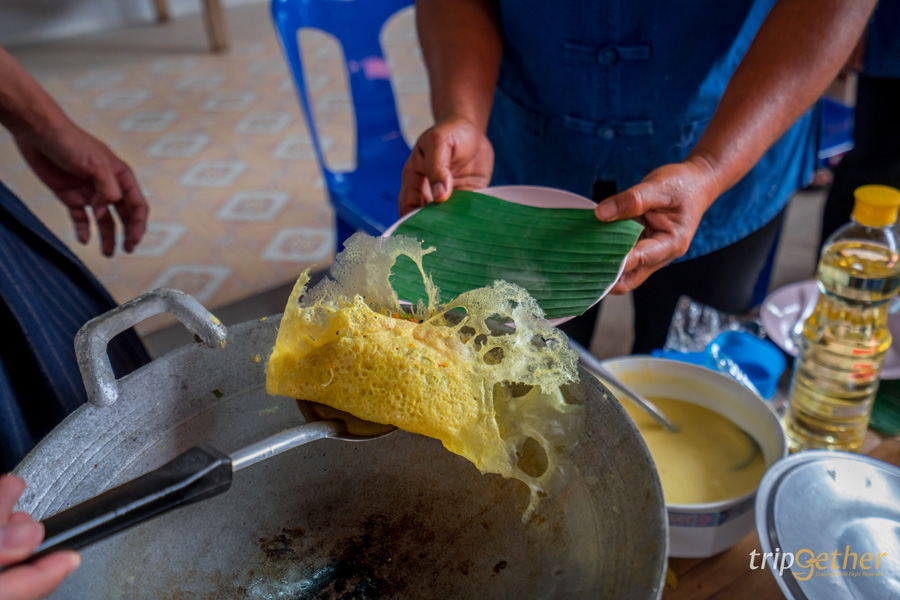กิจกรรมแรกของเรานั่นก็คือ การทำขนมเบื้องญวนสูตรโบราณของท่าขุนราม ยืนดูคุณน้าสาธิตได้สักพัก เราก็จัดเลย รอบนี้ขอฝึกเป็นผู้ช่วยคุณน้าไปก็แล้วกัน