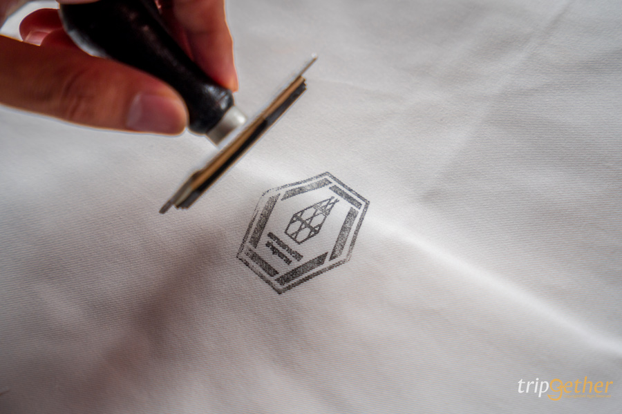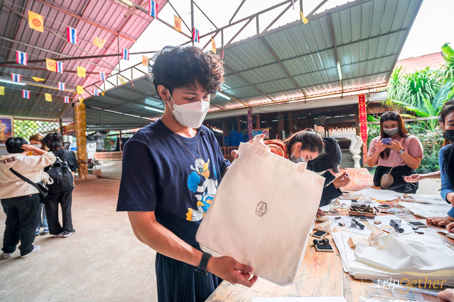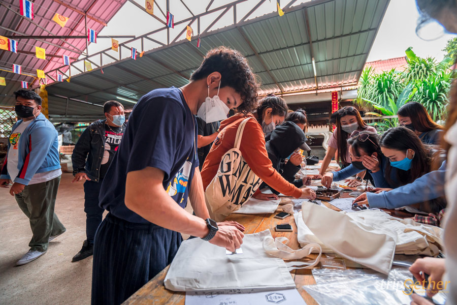 รองท้องด้วยของว่างแสนอร่อยแล้ว ยังมีอีกกิจกรรมให้เราได้ทำ นั่นก็คือ การพิมพ์ถุงผ้า และจะบอกว่าลายที่เราพิมพ์เป็นลายที่น้องๆ ในชุมชนออกแบบเองซึ่งเป็นสัญลักษณ์ของชุมชน นั่นก็คือ ก๋วย หรือ ชะลอมสาน ที่มาจากประเพณีต๋านก๋วยสลากซึ่งเป็นประเพณีประจำตำบลนั่นเอง สร้างสรรค์สุดๆ เลย ถือว่าได้ของฝากสุดเก๋ที่หาจากที่ไหนไม่ได้อีกแล้วไปฝากเพื่อนๆ ด้วย