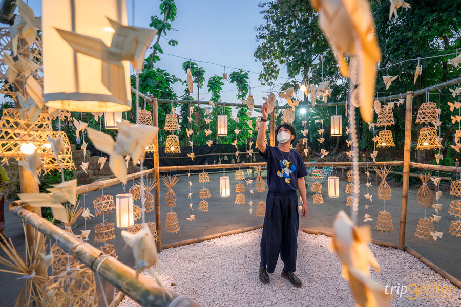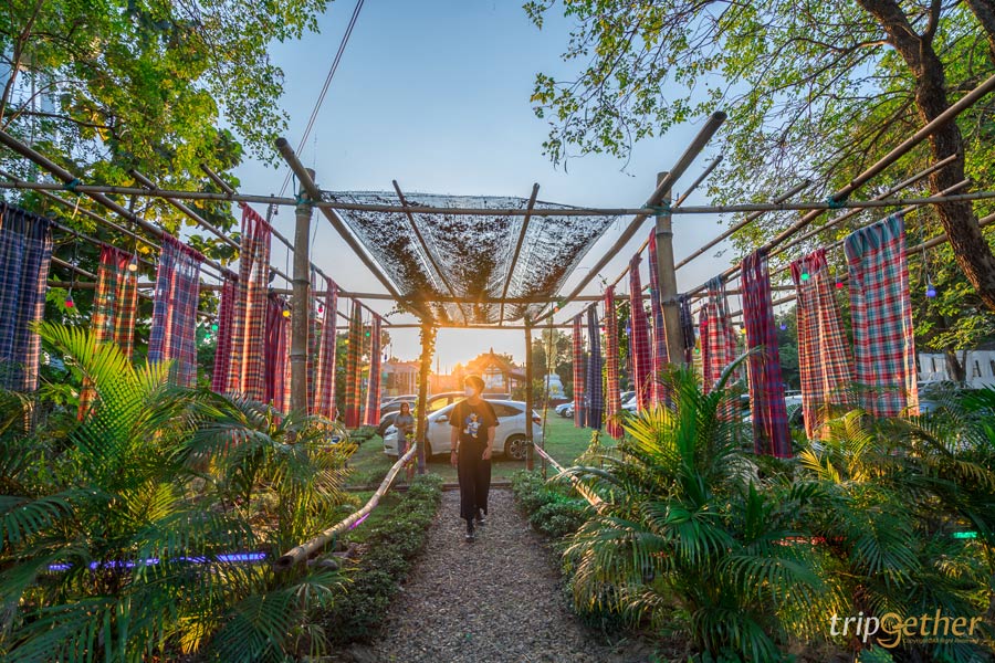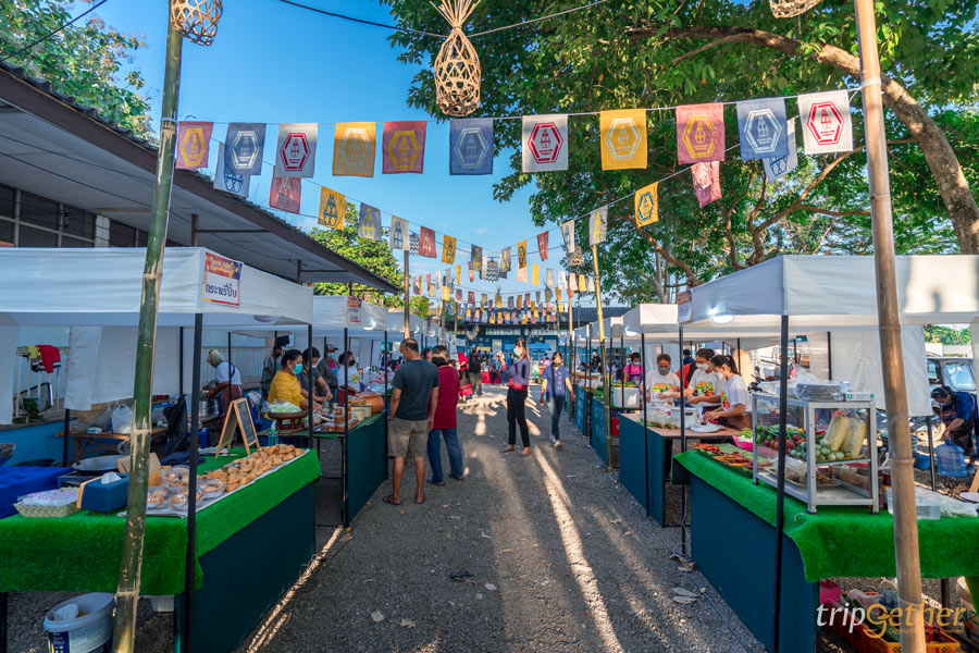 หลังจากทำกิจกรรมทั้งสองเสร็จ แสงอาทิตย์ก็เริ่มทอสีทองเตรียมลาท้องฟ้าไป จังหวะดีกับที่ตลาด 3 วิถีตั้งร้านเรียบร้อยพอดี ทางเดินเข้าตลาดตกแต่งสวยมาก เหมือนงานอาร์ตเล็กๆ งานหนึ่งเลย และทั่วทั้งงานเราก็จะเห็นสัญลักษณ์ของชุมชนที่เป็นก๋วยอยู่ในทุกจุดเลย