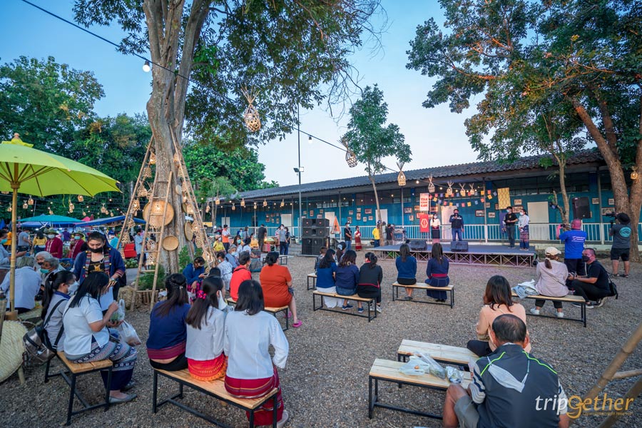 ได้ของกินแล้วเราก็มาจับจองที่นั่ง โชคดีมากได้นั่งในมุมที่เห็นเวทีชัดมาก ความน่ารักของที่นี่คือมีการแสดงจากน้องๆ และคุณลุงคุณป้าในชุมชนให้ดูเพลินๆ ตอนกินข้าวด้วยแหละ