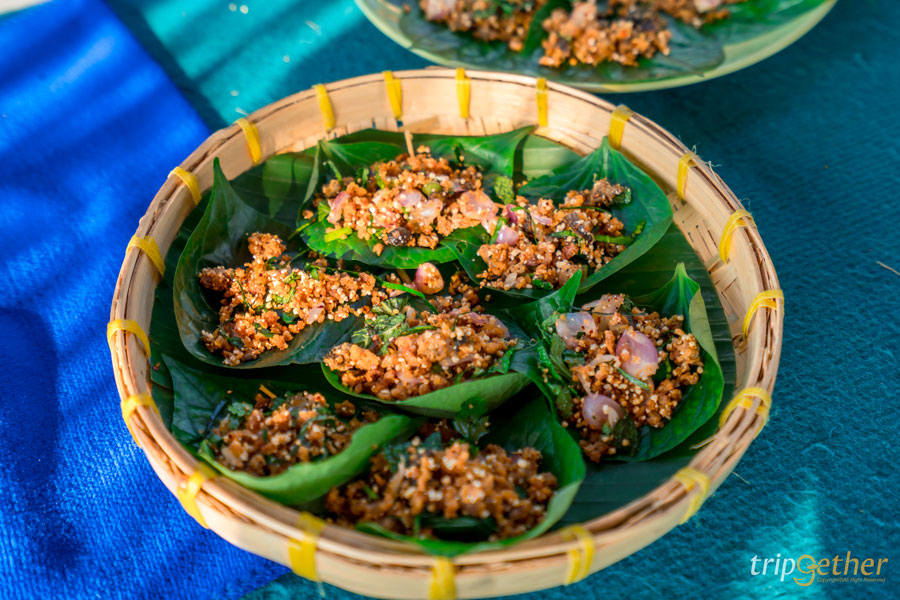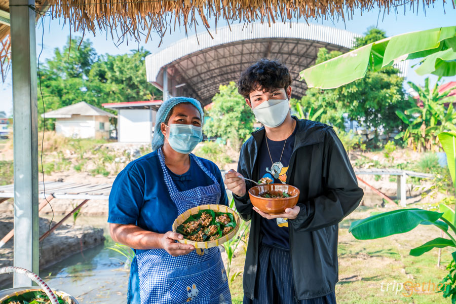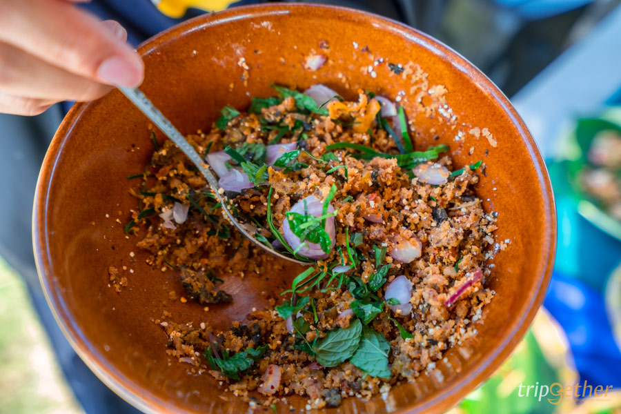ที่สำคัญเรามาที่นี่เพื่อเรียนรู้การทำอาหารสุดครีเอทโดยใช้วัตถุดิบจากพื้นที่ล้วนๆ นั่นก็คือ เมี่ยงลาบปลาดุก เมนูนี้บอกเลยว่าเฮลตี้สุดๆ เพราะอุดมไปด้วยสมุนไพรสุดหอมที่กินพร้อมกับปลาดุกกรอบๆ ที่ปรุงรสลาบมาอย่างดี นอกจากจะได้เรียนรู้การทำเมนูอาหารรสเลิศแล้ว ยังได้เรียนรู้วิถีชีวิตการทำเกษตรของชาวท่าขุมรามไปพร้อมๆ กันด้วย เป็นอีกบทเรียนหนึ่งที่ได้อะไรเยอะมากๆ