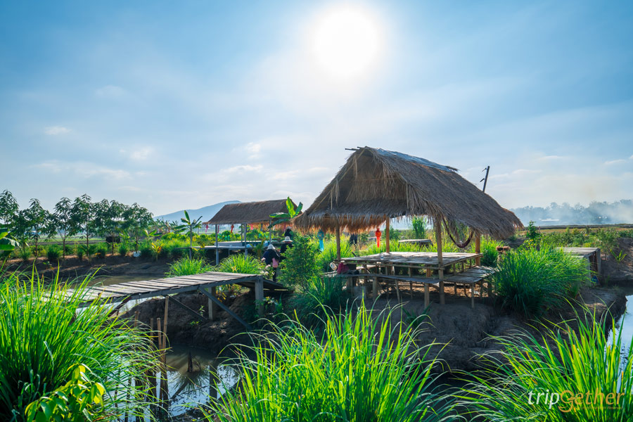 เติมพลังกันเรียบร้อยแล้ว เราก็มาที่โคกหนองนาโมเดล สถานที่ทดลองการใช้พื้นที่ทำการเกษตรแบบผสมผสานที่บรรยากาศสุดชิลล์ ให้ฟีลความสบายใจแบบท้องทุ่งมาก มีพืชที่ใช้ประโยชน์ได้เต็มไปหมด ไม่ว่าจะเป็นกล้วย พริกไทย ฟัก กระเจี๊ยบ ตะไคร้ ผักกาด สะระแหน่ ต้นหอม มะพร้าว บัว และอื่นๆ อีกมากมาย