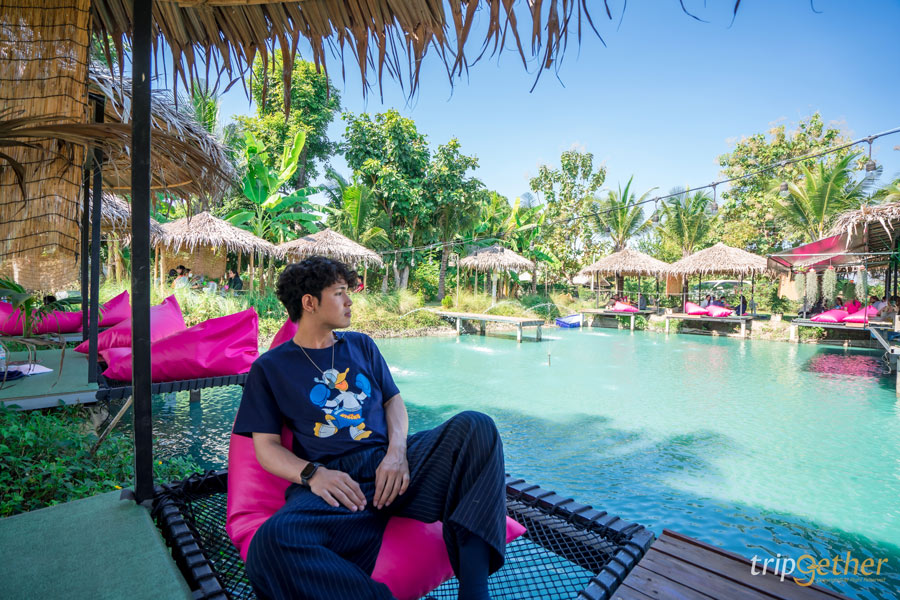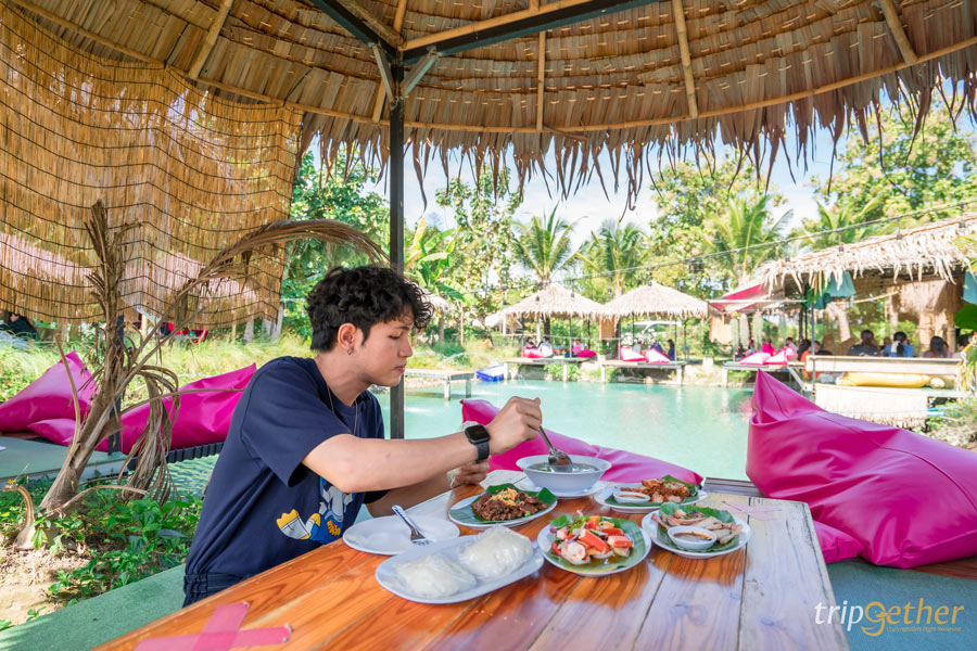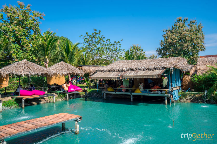 อิ่มบุญเต็มๆ กันในช่วงเช้าไปแล้วเราก็มาอิ่มท้องกันต่อที่ ร้านแซ่บนัว ครัวริมน้ำ ร้านอาหารบรรยากาศดีที่มีสระน้ำสีเขียวมรกตอยู่ใจกลาง ในร้านมีโซนที่นั่งให้เลือกทั้งแบบโถงด้านหน้าร้านและโซนซุ้มริมสระน้ำที่ตอบโจทย์ความเป็นส่วนตัวสุดๆ