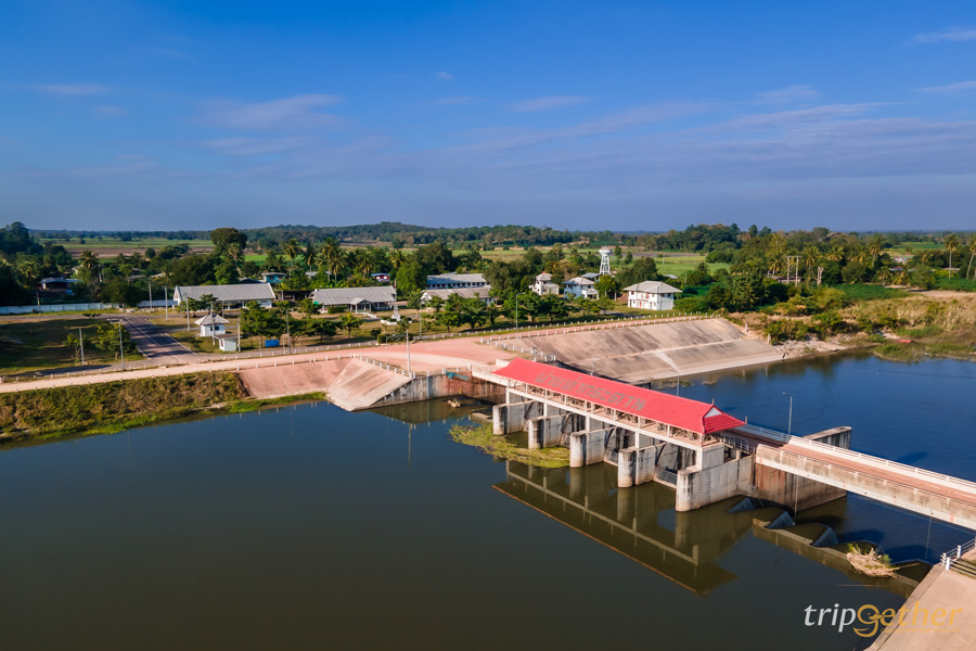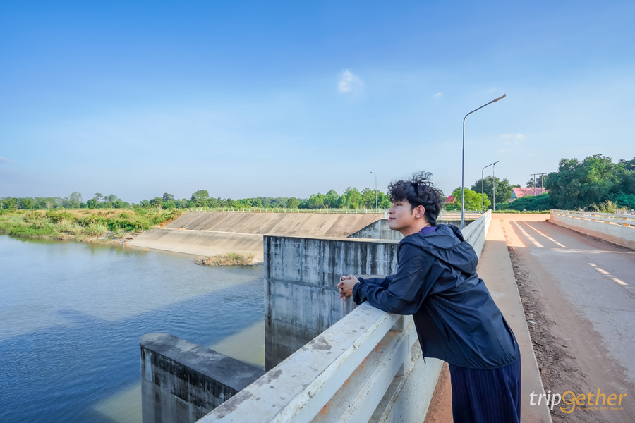หลังจากพักผ่อนและกินของว่างที่โคกหนองนาโมเดลแล้ว เราก็แวะมาเดินเล่นชิลล์ๆ ริมฝาย รับลมและให้เสียงน้ำกล่อมความรู้สึกสักหน่อยกันที่ฝายท่ากระดาน แหล่งน้ำที่หล่อเลี้ยวชีวิตชาวท่าขุนรามมาตั้งแต่อดีตจนถึงปัจจุบัน ภาพของแสงอาทิตย์ที่สะท้อนผืนน้ำระยิบระยับในช่วงบ่ายแก่ๆ พร้อมกับภาพวิวภูเขาไกลๆ เป็นฉากหลัง ทำให้ใจเผลอหลุดลอยไปกับธรรมชาติได้เลยนะเนี่ย