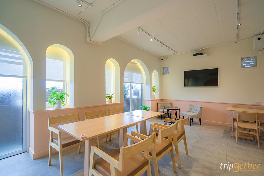 โซนที่นั่งของร้านส่วนใหญ่จะเน้นไปที่ชั้น 2 มาพร้อมกับการตกแต่งแบบเรียบหรู เน้นใช้โทนสีขาวและชมพูที่ให้ความรู้สึกอบอุ่น น่ารัก และผ่อนคลายสบายตา โต๊ะที่นั่งมีทั้งโซฟานุ่มๆ พร้อมด้วยมุมฉากหลังสีชมพูสุดน่ารัก โต๊ะไม้ยาวสไตล์มินิมอล ซึ่งรองรับได้ทั้งแบบมาคนเดียว มาเป็นคู่ หรือจะมาเป็นกลุ่ม ทางร้านก็มีโซนที่เป็นมุมส่วนตัว สำหรับนั่งประชุมกันอีกด้วย