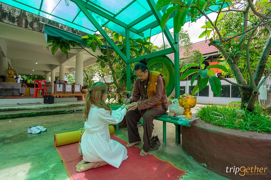 ต้องบอกว่าวันนี้เราโชคดีมากๆ เพราะทางวัดได้เชิญอาจารย์โอม มนต์ขลัง มาทำพิธีเสริมดวงชะตาให้กับผู้ที่มาวัดแดงธรรมชาติ โดยพิธีที่อาจารย์ทำให้เป็นการลงนะหน้านารายณ์และเขียนลายมือ หากเราอยากเน้นเสริมดวงชะตาด้านไหนก็สามารถแจ้งอาจารย์ได้เลย ในเรื่องของค่าครูตามแต่กำลังศรัทธาของแต่ละคน และเมื่อเสร็จพิธีอาจารย์ท่านก็จะมอบเหรียญและรูปของหลวงพ่อกวย พระเกจิอาจารย์ชื่อดังให้เป็นที่ระลึกอีกด้วย