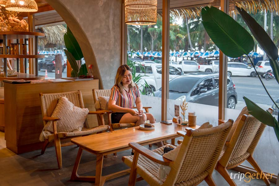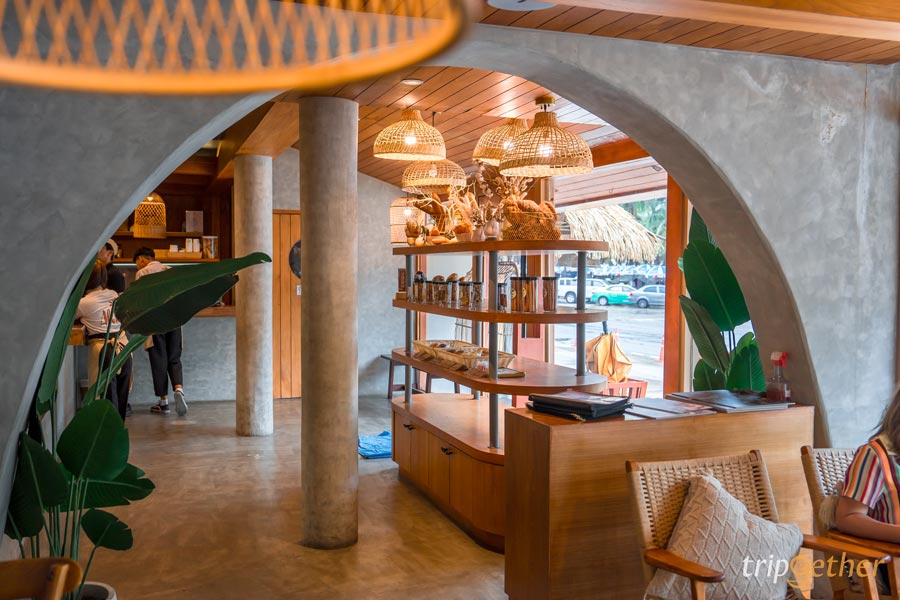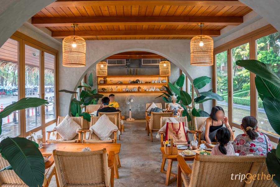 ภายในร้านตกแต่งโทนสีอุ่นอย่างสีน้ำตาลอ่อน สีขาว และแซมด้วยสีเขียวของต้นไม้ ได้บรรยากาศอบอุ่นละมุนตา มีกระจกรอบด้านให้ได้นั่งมองวิวทะเลและชายหาด