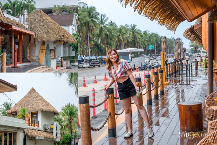 นั่งเล่นชายหาดบางแสนกันได้สักพักสายฝนก็เริ่มทำหน้าที่โปรยปรายลงมา เราเลยวิ่งมาหลบฝนกันที่ Aloha Beach Cafe จากตอนแรกที่ตั้งใจจะมาหลบฝน แต่กลับเจอพิกัดคาเฟ่สุดปังติดทะเลบางแสน ที่ตกแต่งร้านสไตล์บาหลี บรรยากาศดี๊ดี มีมุมถ่ายรูปทั้ง Indoor และ Outdoor เลย