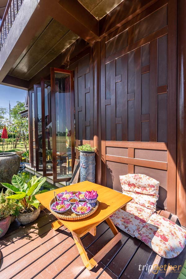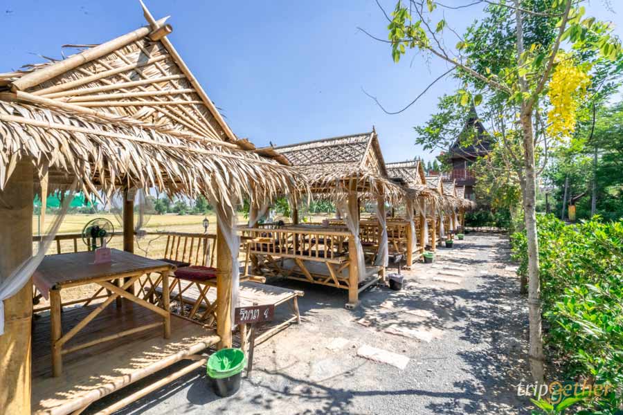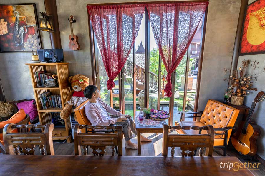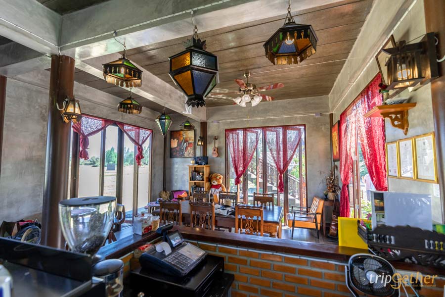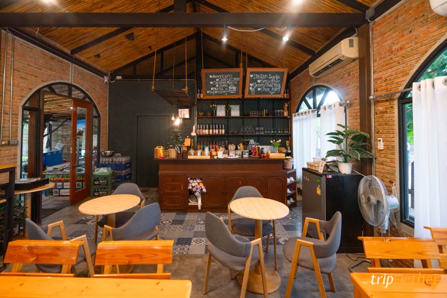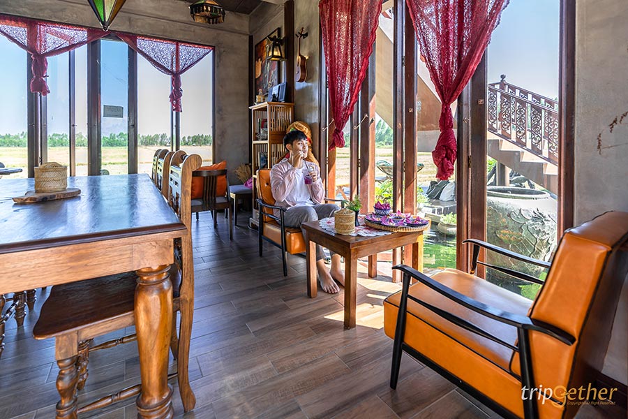 โซนชั้นล่างจะเป็นคาเฟ่ มีให้เลือกนั่งได้ทั้งอินดอร์และเอ้าท์ดอร์ ทั้งกระท่อมไม้ไผ่ มุมชานเรือนริมทุ่งนา และมุมในตัวร้านที่บรรยากาศดีสุดๆ ในส่วนของชั้นบนเปิดเป็นห้องพักสำหรับใครที่อยากพักค้างคืน