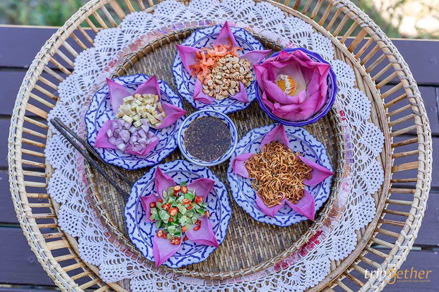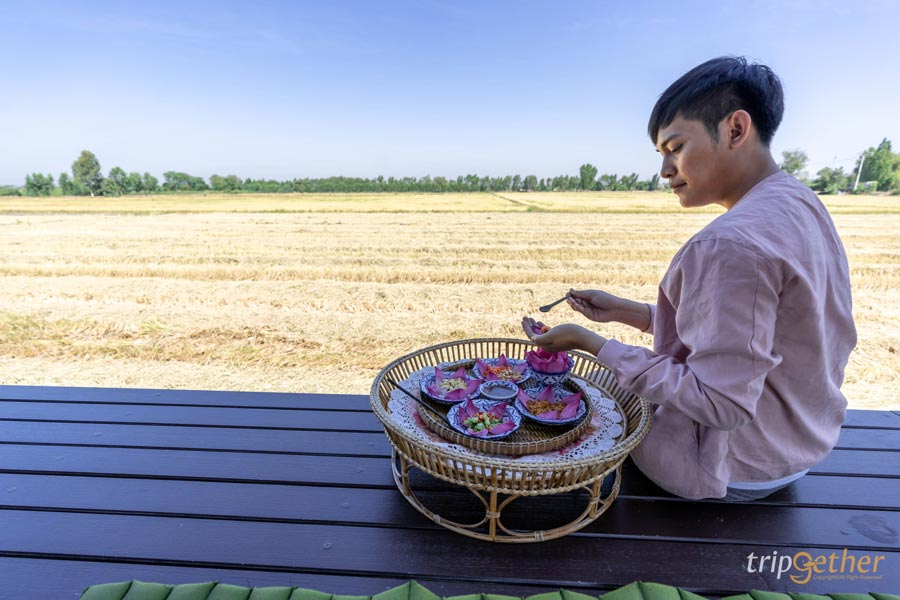 เมนูที่เราสั่งมาชิมวันนี้คือ เมี่ยงกลีบบัว อาหารว่างของคนไทยกินได้ทุกวัย เป็นเมนูซิกเนเจอร์ของทางร้านโดยใช้กลีบบัวหลวงสีชมพูที่ปลูกเองแบบปลอดสารเคมี เสิร์ฟพร้อมเครื่องเคียง อย่าง กุ้งแห้ง ถั่วลิสงคั่ว ขิง หอมแดง มะพร้าวคั่ว มะนาว พริก และน้ำเมี่ยงสูตรคุณยายทวด หอม อร่อย ครบรสถึงเครื่อง แถมจัดตกตแต่งสำรับมาอย่างสวยงามถ่ายรูปอวดโซเชียลเก๋ๆ
