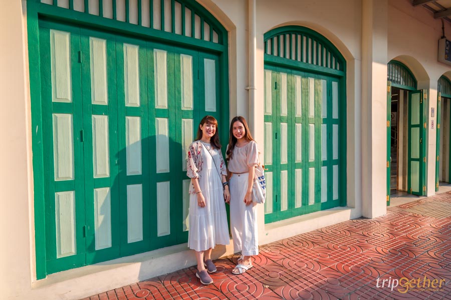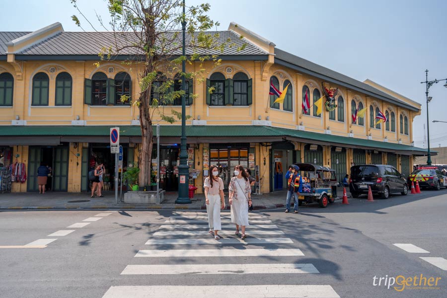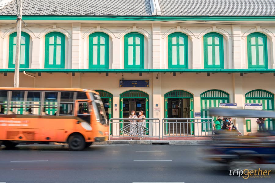 นกที่ตื่นเช้าคือนกที่ตามหาร้านอร่อย! เริ่มต้น One day trip เที่ยวกรุงเทพ กับจุดนัดพบแรกก็คือ MRT สถานีสามยอด ประตูทางออก 3 ในยามเช้าแบบนี้ก็ต้องหาอะไรกินรองท้องเบาๆ กันก่อน แต่สายคอนเท็นอย่างเราๆ เห็นสถาปัตยกรรมสวยๆ สไตล์ชิโน – โปรกุตีส ของสถานีสามยอดแล้วก็ต้องยกโทรศัพท์ขึ้นมาแชะภาพคู่กับอาคารสีครีมและตัดกับกรอบหน้าต่างสีเขียวสุดชิคนี้ไว้ก่อนเลยเป็นอันดับแรก