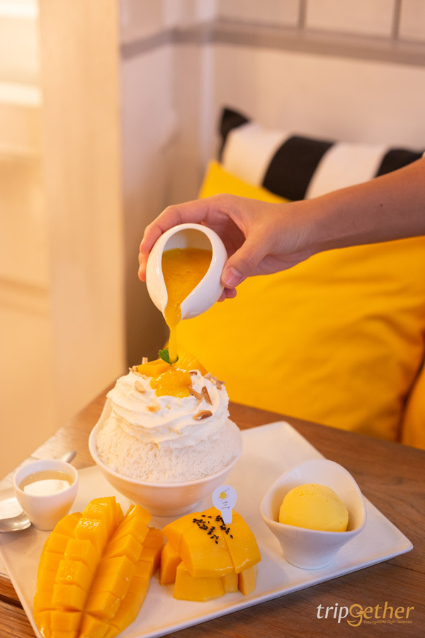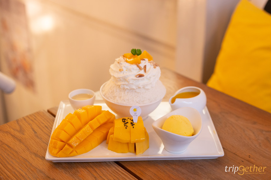 และเมนูขายดีของทางร้านอย่าง Mango Bingsu บิงซูนมท็อปปิงด้วยมวิปครีม และม่วงน้ำดอกไม้ เสิร์ฟมาคู่กับมะม่วงน้ำดอกไม้ทั้งลูกที่หั่นมาแบบพอดีคำ ไอศกรีมมะม่วง ซอสมะม่วง และนมข้นหวาน กินรวมกันแล้วสดชื่นสุดๆ ช่วยให้เรากระปรี้กระเปร่าเหมือนได้รีเฟรชร่างกาย