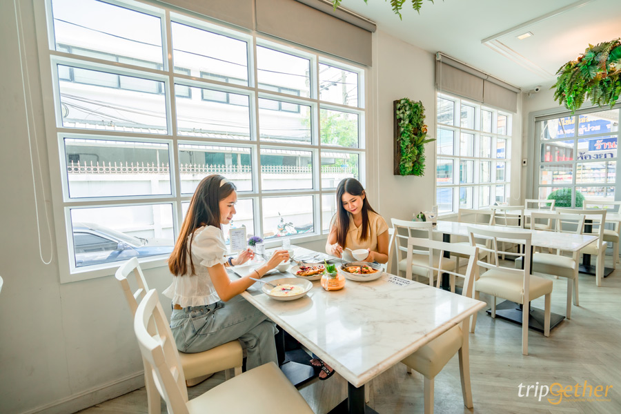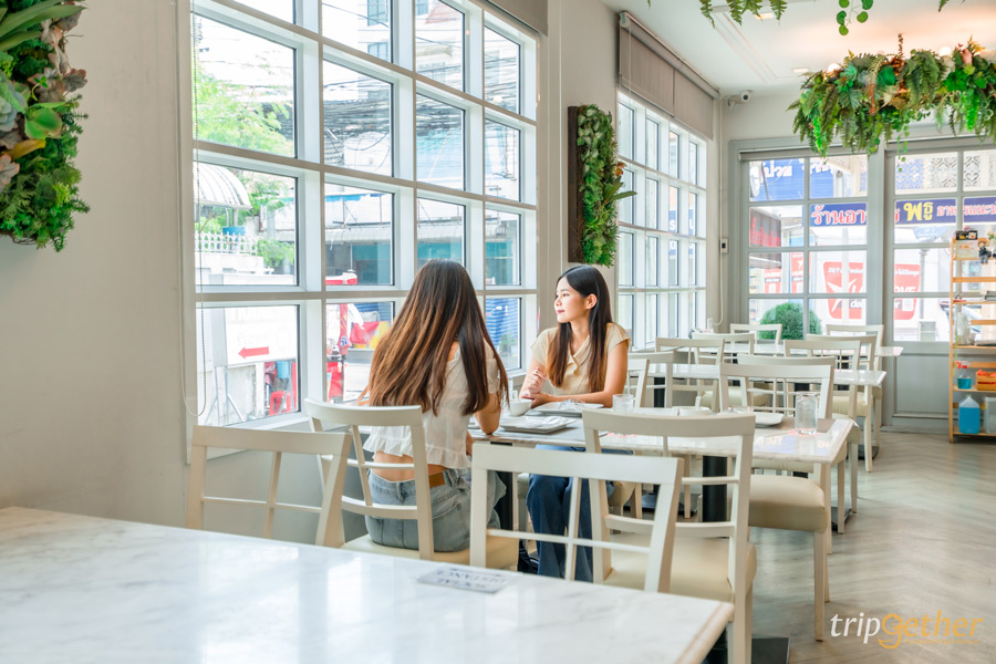 ร้านมีโซนที่นั่งทั้งอินดอร์และเอาท์ดอร์ วันนี้เราเลือกนั่งกันในร้าน ภายในร้านตกแต่งด้วยสีขาวเป็นหลัก แซมด้วยสีเขียวจากต้นไม้เล็กๆ มองดูสบายตา มีหน้าต่างรอบร้าน รับแสงจากธรรมชาติ นั่งถ่ายรูปก็สวยปังสุดๆ