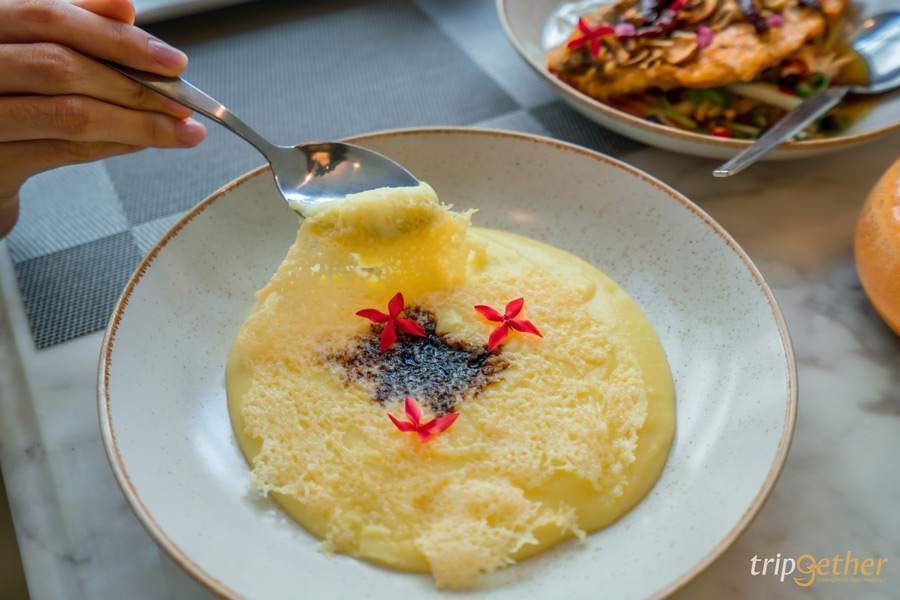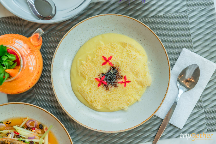และเมนูสุดท้ายของมื้อนี้ก็คือมันบด ราคา 100 บาท มันฝรั่งบดเนื้อเนียน มาพร้อมกับซอสปรุงรสซ่อนอยู่ตรงกลาง ตกแต่งจานด้วยดอกเข็ม รสชาติหวานมันละมุนลิ้น