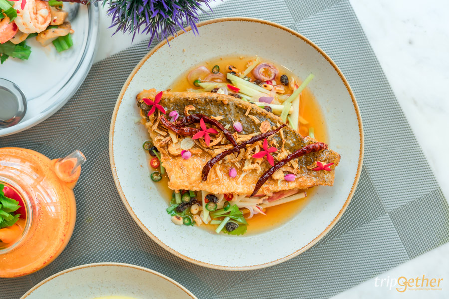 ถัดมาคือเมนูปลากระพงทอดน้ำปลา ราคา 299 บาท ปลากระพงทอดตัวใหญ่ ราดด้วยน้ำปรุงรส ไฮไลท์สุดพิเศษของเมนูนี้คือ ปลากระพงที่เสิร์ฟนั้นเป็นปลากระพงที่ทางร้านเอาก้างออกให้หมดแล้ว ดังนั้นไม่ต้องกลัวว่าจะต้องเอาก้างออกเองให้เลอะเทอะ เนื้อปลากระพงแน่นๆ ตัดกับรสชาติเปรี้ยวหวานอร่อยถึงใจ เป็นอีกเมนูที่ต้องลอง