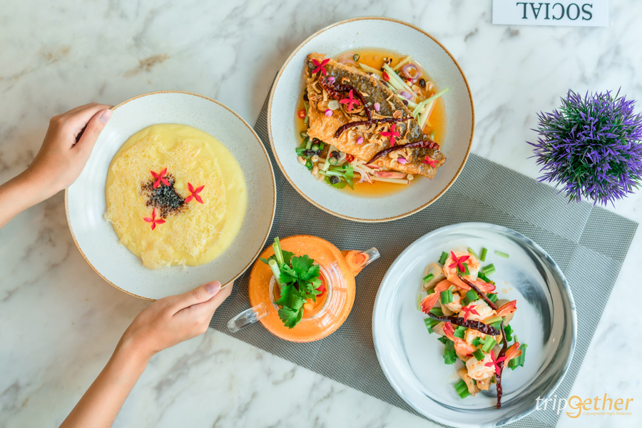 เมนูของร้านมีทั้งเมนูอาหารไทยและอาหารยุโรปแนวฟิวชั่น วันนี้เราสั่งกันมาทั้งหมด 3 เมนู ได้แก่ ปลากระพงทอดน้ำปลา ต้มยำกุ้ง และมันบด เรียกได้ว่ามาครบทั้งอาหารไทยและต่างประเทศเลยทีเดียว