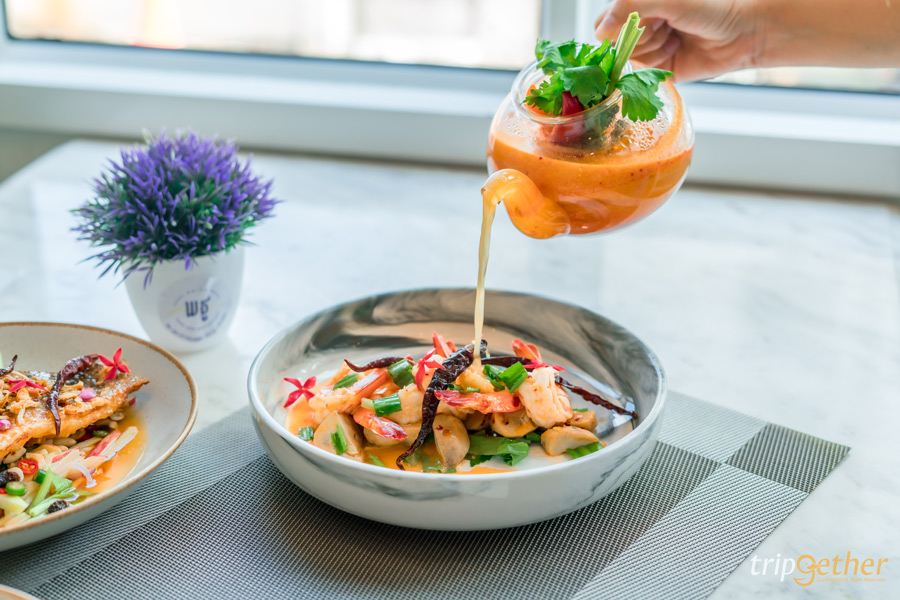 เริ่มจาก ต้มยำกุ้ง เป็นจานแรก ราคา 269 บาท บอกเลยว่าต้มยำกุ้งของที่นี่ไม่เหมือนที่อื่น เพราะว่าน้ำต้มยำจะเสิร์ฟมาในกาน้ำชาพร้อมกับกุ้งที่ตกแต่งอย่างสวยงามอยู่บนจาน ให้เราได้เทน้ำต้มยำลงไปเอง จังหวะที่กำลังเทน้ำต้มยำลงไปบนจานนี่สามารถถ่ายสตอรี่อวดเพื่อนได้เลย ส่วนรสชาติก็เข้มข้นกลมกล่อมถถูกใจสุดๆ โดยเฉพาะเนื้อกุ้งแน่นๆ ที่เสิร์ฟมาแบบเต็มปากเต็มคำ เป็นเมนูที่ไม่ควรพลาดทุกประการ
