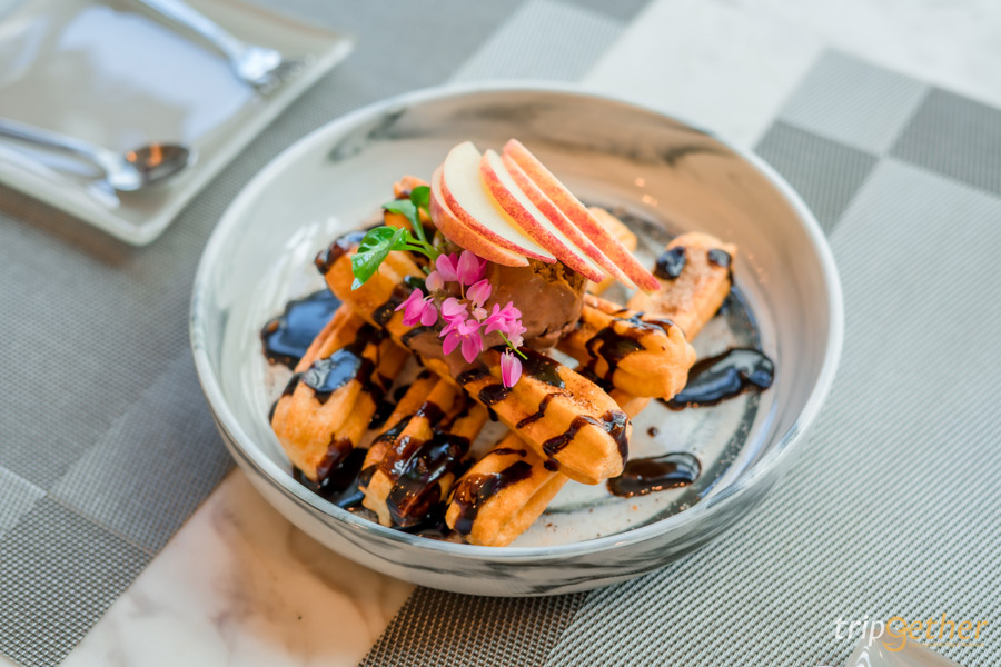 ยังไม่หมดแค่นี้ เราปิดท้ายมื้อนี้กันด้วยของหวานอย่าง ชูโรส ที่เสิร์ฟพร้อมไอศกรีมช็อกโกแลตและแอปเปิ้ล เป็นของหวานสไตล์โฮมเมดที่รับรู้ได้ถึงความพิถีพิถันในการทำของร้าน เมนูนี้ราคา 180 บาท
