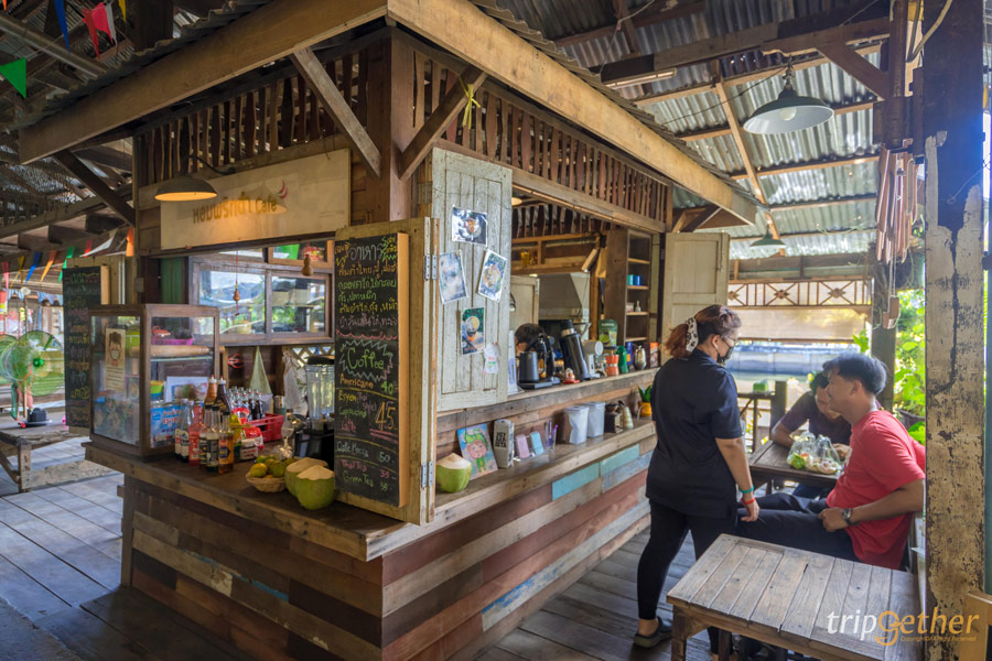 ปิดท้ายของวันด้วย คาเฟ่ สี่แยกหัวตะเข้คาเฟ่ แอนด์เกสท์เฮ้าส์ ตั้งอยู่ในตลาดเก่าหัวตะเข้ ที่มีความคลาสสิกที่การตกแต่งร้านด้วยบ้านไม้กับบรรยากาศสุดชิลล์รับลมเย็นๆ ดูวิถีชาวบ้านที่ขับเรือผ่านไปมา ที่ร้านมีเมนูอาหารและเครื่องดื่มเยอะมากๆ ราคาสบายกระเป๋า เลยสั่งเป็นขนมปังเนยนม ราคาแผ่นละ 18 บาท และเครื่องดื่มสั่งเป็นชาเนสทีกับนมสดเย็น ราคา 45 บาท ภายในร้านโปร่งโล่งตกแต่งด้วยของเก่าวินเทจเหมาะกับมานั่งชิลล์กับเพื่อนๆ หรือครอบครัว จุดเด่นของทางร้านคือ น้องแมวที่จะมาลงเรือไปพร้อมกับลูกค้า น้องๆ น่ารักเป็นมิตรสุดๆ แต่ใครที่สนใจจะลงเรือไปพร้อมกับน้องแมวต้องจองผ่านเพจของทางร้านมาก่อนล่วงหน้า ไปพายเรือชมบรรยากาศกับน้องๆ ได้เลย พี่เจ้าของร้านและพนักงานใจดีเป็นกันเองมาก ใครมาเที่ยวหรือมองหาคาเฟ่ก็อย่าลืมตามมาเช็คอินกันได้เลย