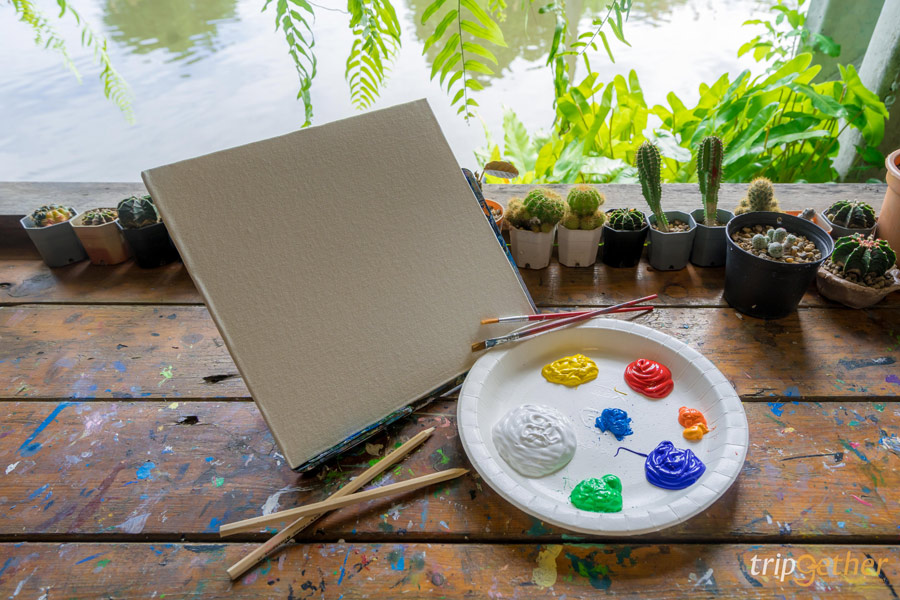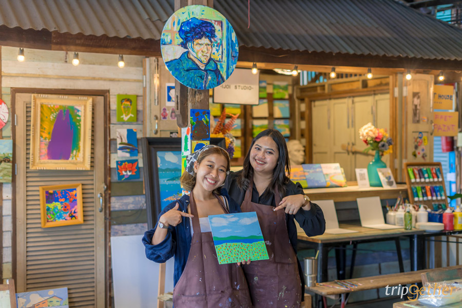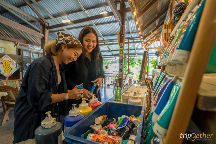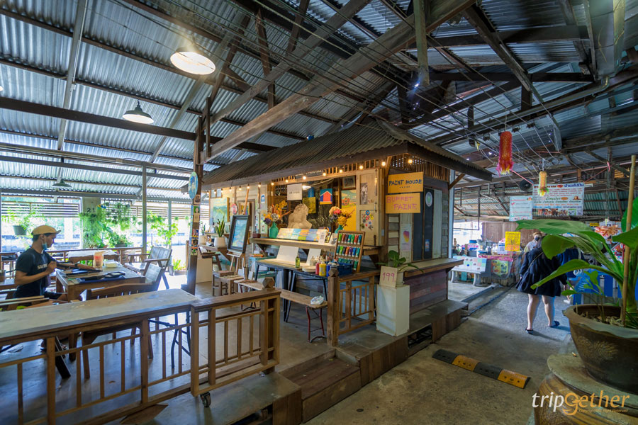ดื่มด่ำกับบรรยากาศภาพวาดสวยๆ ตามกำแพงและความคลาสสิกกันแล้วเดินมาสุดทางท้ายตลาดจะมีร้าน IJOI STUDIO ที่นี่เป็นสตูดิโอวาดรูปที่ให้พวกเราเข้าไปวาดรูปเล่นได้ เพราะ concept ของพี่เจ้าของร้านคือ หาคนมาวาดรูปเป็นเพื่อน ภายในร้านให้ความรู้สึกสงบมากๆ เหมาะกับการมาพักผ่อน โดยทางร้านเริ่มต้นราคาที่ 99 – 199 บาท ขึ้นอยู่กับขนาดของเฟรมภาพ ราคาทั้งหมดรวม ค่าสี ค่าพู่กัน คุ้มมากๆ กับการได้นั่งชิลล์ๆ วาดภาพระบายสีเพลินๆ มองวิวและรับลมเย็นๆ พี่เจ้าของร้านใจดีมากๆ เราสามารถนำน้ำ อาหารจากร้านอื่นเข้ามาได้ด้วย จะนั่งนานแค่ไหนก็ได้เลยสีก็เติมไม่อั้นระบายจนกว่าจะได้ภาพที่ถูกใจได้เต็มที่ ใครมาเที่ยวก็อย่าลืมแวะมาเป็นจิตรกรกันได้มีรูปเก๋ๆ จากฝีมือเรากลับบ้านไปแน่นอน