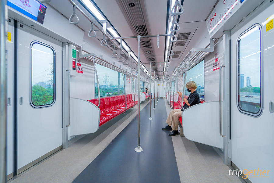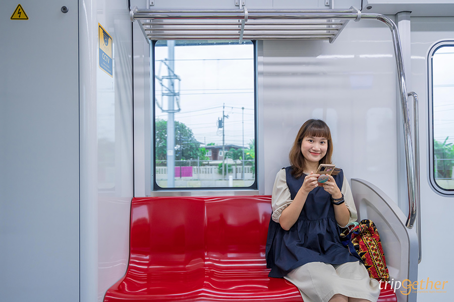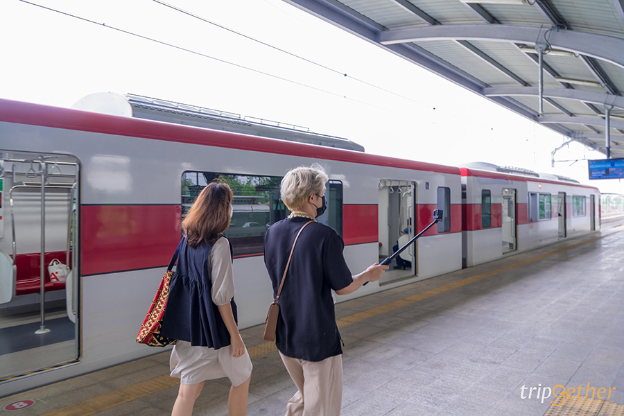 เราเริ่มต้นทริปนครปฐมกันที่สถานีกลางบางซื่อ ด้วยการนั่งรถไฟฟ้าสายสีแดง หรือรถไฟชานเมืองสายสีแดง ที่ชานชาลาหมายเลข 9 – 10 เพื่อไปที่สถานีปลายทางตลิ่งชัน ซึ่งเป็นสถานีที่เชื่อมกับต่อขบวนรถพิเศษหรือรถไฟ Feeder ที่เราจะนั่งไปทริปนครปฐมในวันนี้กัน
