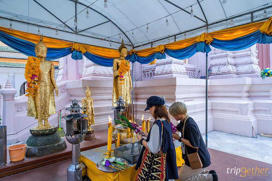 เมื่อเดินขึ้นมาถึงแล้วก็นำดอกไม้ธูปเทียน เข้าไปกราบสักการะ ขอพรเพื่อความเป็นสิริมงคลกันสักหน่อย พร้อมทั้งปิดทองพระร่วงโรจนฤทธิ์องค์จำลอง