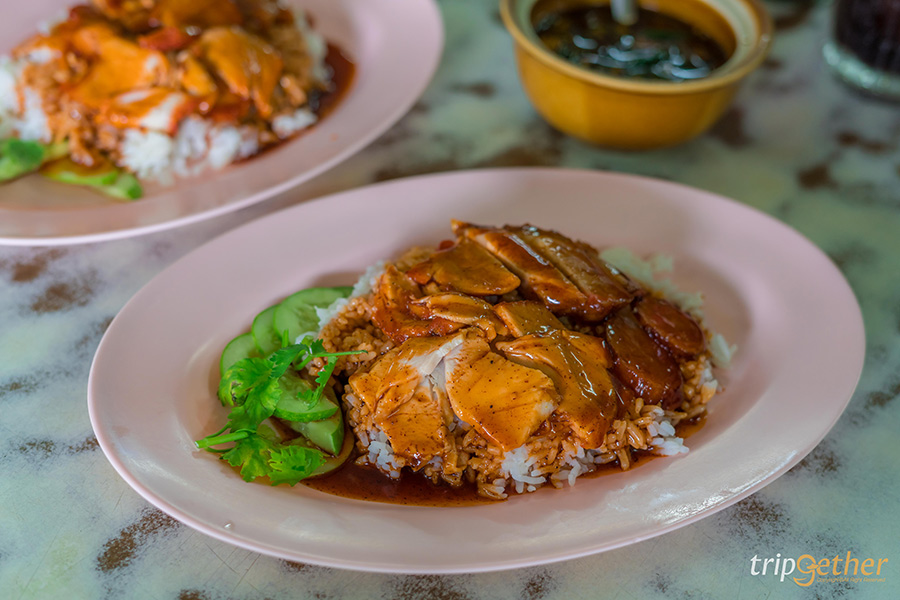 เมนูของร้านมีให้เลือกมากมาย ทั้งข้าวหมูแดง ข้าวมันไก่ ฯลฯ หรือจะเป็นเมนูก๋วยเตี๋ยว ทั้งก๋วยเตี๋ยวลูกชิ้นปลา ก๋วยเตี๋ยวเป็ดตุ๋น นอกจากนี้ยังมีเครื่องดื่มสุดชื่นใจอีกหลากหลายเมนูให้เลือกเพียบ สำหรับเราสั่งเป็นเมนูข้าวหมูกรอบหมูแดง (ใส่ทุกอย่าง) ในราคา 45 บาท บอกเลยว่าคุ้มค่ามาก เพราะหมูกรอบเนื้อแน่นๆ กรอบ หมูแดงเนื้อแน่น มาพร้อมกับน้ำราดหอมและกลมกล่อม อร่อยสมคำร่ำลือ และเครื่องดื่มชาดำเย็น ทั้งหอมกลิ่นชาและหวานกำลังดี ราคา 15 บาท และน้ำกระเจี๊ยบที่เป็นแบบขวด สามารถเทใส่แก้วเย็นๆ ได้ ราคาเพียง 20 บาทเท่านั้น